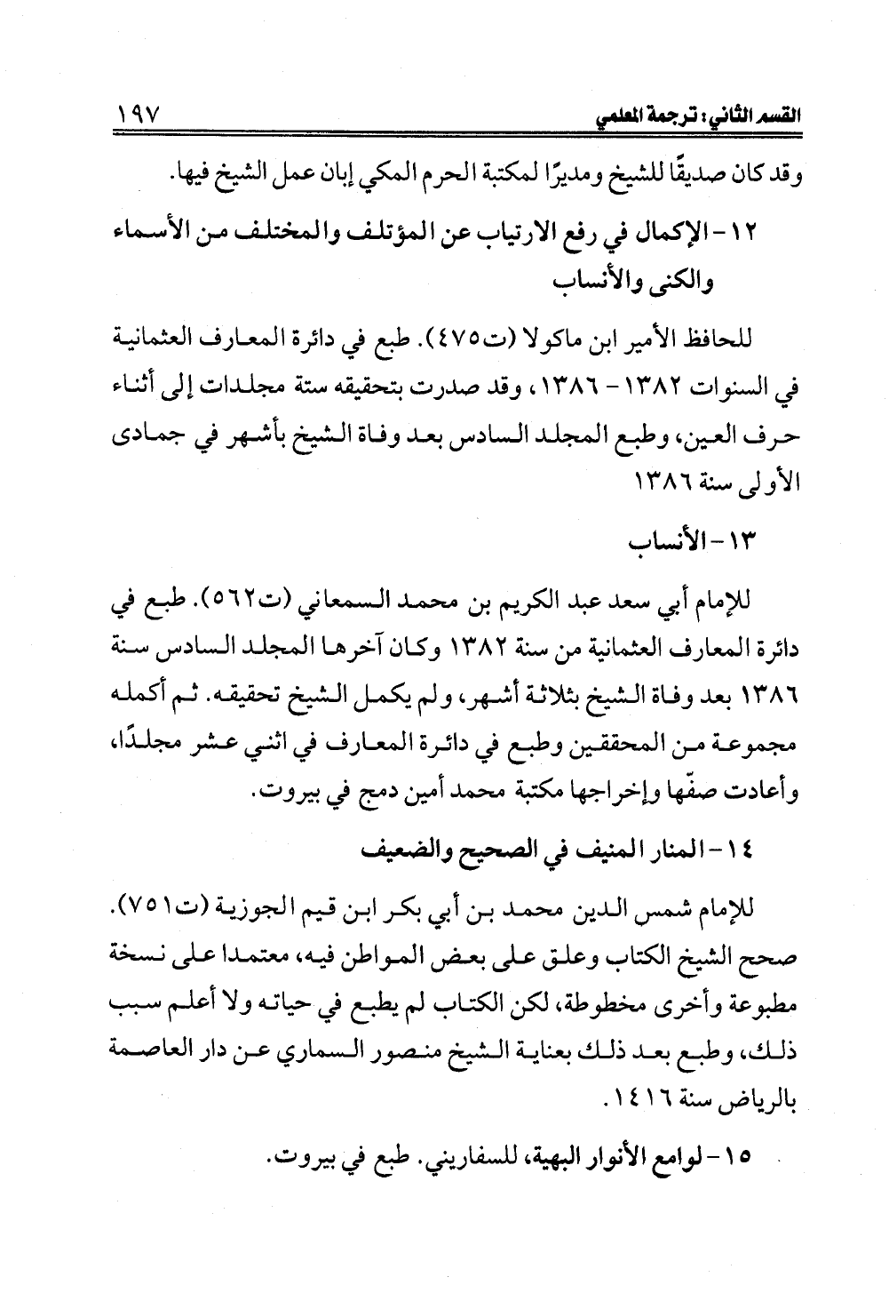 للإمام أبي سعد عبد الكريم بن محمد السمعاني (ت ٥٦٢). طبع في دائرة المعارف العثمانية من سنة ١٣٨٢ وكان آخرها المجلد السادس سنة ١٣٨٦ بعد وفاة الشيخ بثلاثة أشهر، ولم يكمل الشيخ تحقيقه. ثم أكمله مجموعة من المحققين وطبع في دائرة المعارف في اثني عشر مجلدًا، وأعادت صفّها وإخراجها مكتبة محمد أمين دمج في بيروت.