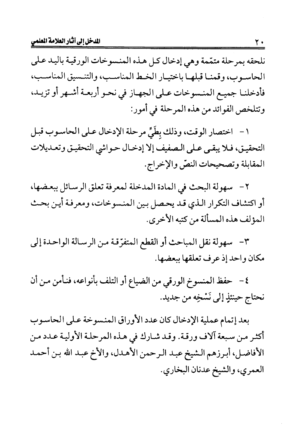 نلحقه بمرحلة متمّمة وهي إدخال كل هذه المنسوخات الورقية باليد على الحاسوب، وقمنا قبلها باختيار الخط المناسب، والتنسيق المناسب، فأدخلنا جميع المنسوخات على الجهاز في نحو أربعة أشهر أو تزيد، وتتلخص الفوائد من هذه المرحلة في أمور: