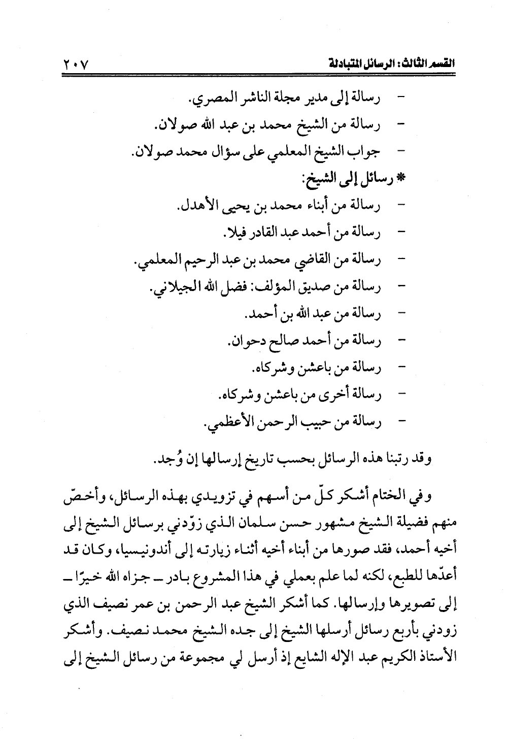 وفي الختام أشكر كلّ من أسهم في تزويدي بهذه الرسائل، وأخصّ منهم فضيلة الشيخ مشهور حسن سلمان الذي زوّدني برسائل الشيخ إلى أخيه أحمد، فقد صورها من أبناء أخيه أثناء زيارته إلى أندونيسيا، وكان قد أعدّها للطبع، لكنه لما علم بعملي في هذا المشروع بادر ــ جزاه الله خيرًا ــ إلى تصويرها وإرسالها. كما أشكر الشيخ عبد الرحمن بن عمر نصيف الذي زودني بأربع رسائل أرسلها الشيخ إلى جده الشيخ محمد نصيف. وأشكر الأستاذ الكريم عبد الإله الشايع إذ أرسل لي مجموعة من رسائل الشيخ إلى