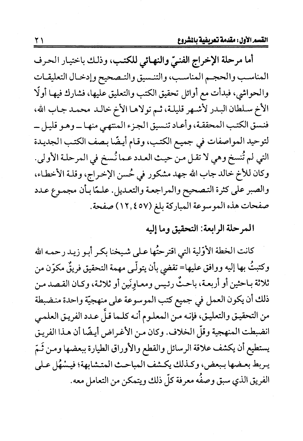 أما مرحلة الإخراج الفنيّ والنهائي للكتب، وذلك باختيار الحرف المناسب والحجم المناسب، والتنسيق والتصحيح وإدخال التعليقات والحواشي، فبدأت مع أوائل تحقيق الكتب والتعليق عليها، فشارك فيها أولًا الأخ سلطان البدر لأشهر قليلة، ثم تولاها الأخ خالد محمد جاب الله، فنسق الكتب المحققة، وأعاد تنسيق الجزء المنتهي منها ــ وهو قليل ــ لتوحيد المواصفات في جميع الكتب، وقام أيضًا بصف الكتب الجديدة التي لم تُنسخ وهي لا تقل من حيث العدد عما نُسخ في المرحلة الأولى. وكان للأخ خالد جاب الله جهد مشكور في حُسن الإخراج، وقلة الأخطاء، والصبر على كثرة التصحيح والمراجعة والتعديل. علمًا بأن مجموع عدد صفحات هذه الموسوعة المباركة بلغ (١٢.٤٥٧) صفحة.