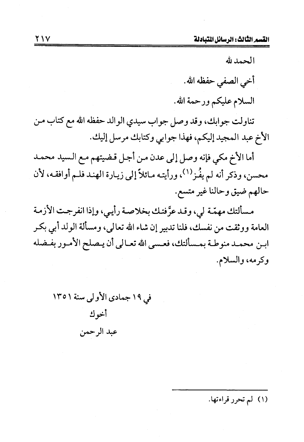 مسألتك مهمّة لي، وقد عرَّفتك بخلاصة رأيي، وإذا انفرجت الأزمة العامة ووثقت من نفسك، فلنا تدبير إن شاء الله تعالى، ومسألة الولد أبي بكر ابن محمد منوطة بمسألتك، فعسى الله تعالى أن يصلح الأمور بفضله وكرمه، والسلام.