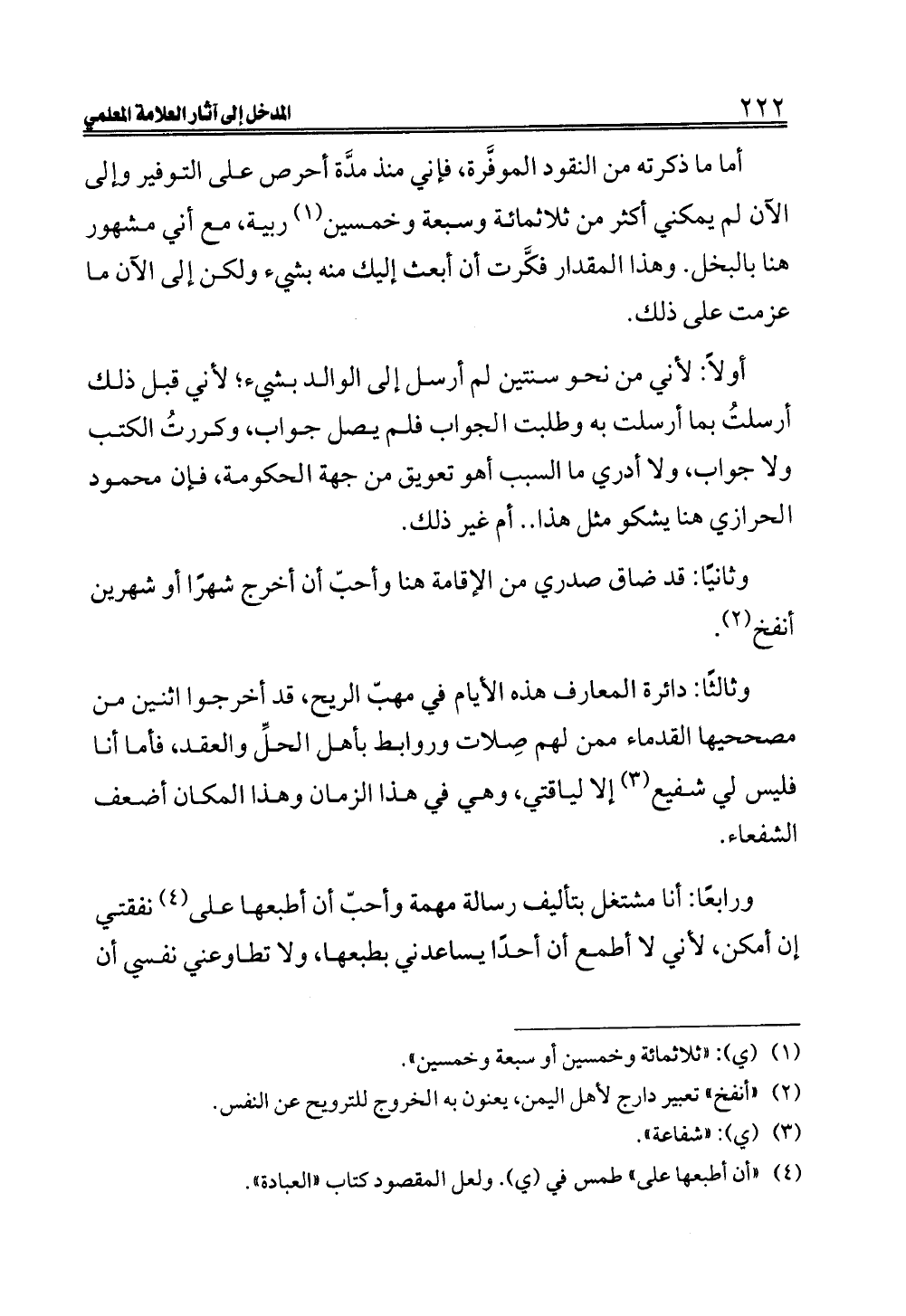 ورابعًا: أنا مشتغل بتأليف رسالة مهمة وأحبّ أن أطبعها على (¬٤) نفقتي إن أمكن، لأني لا أطمع أن أحدًا يساعدني بطبعها، ولا تطاوعني نفسي أن