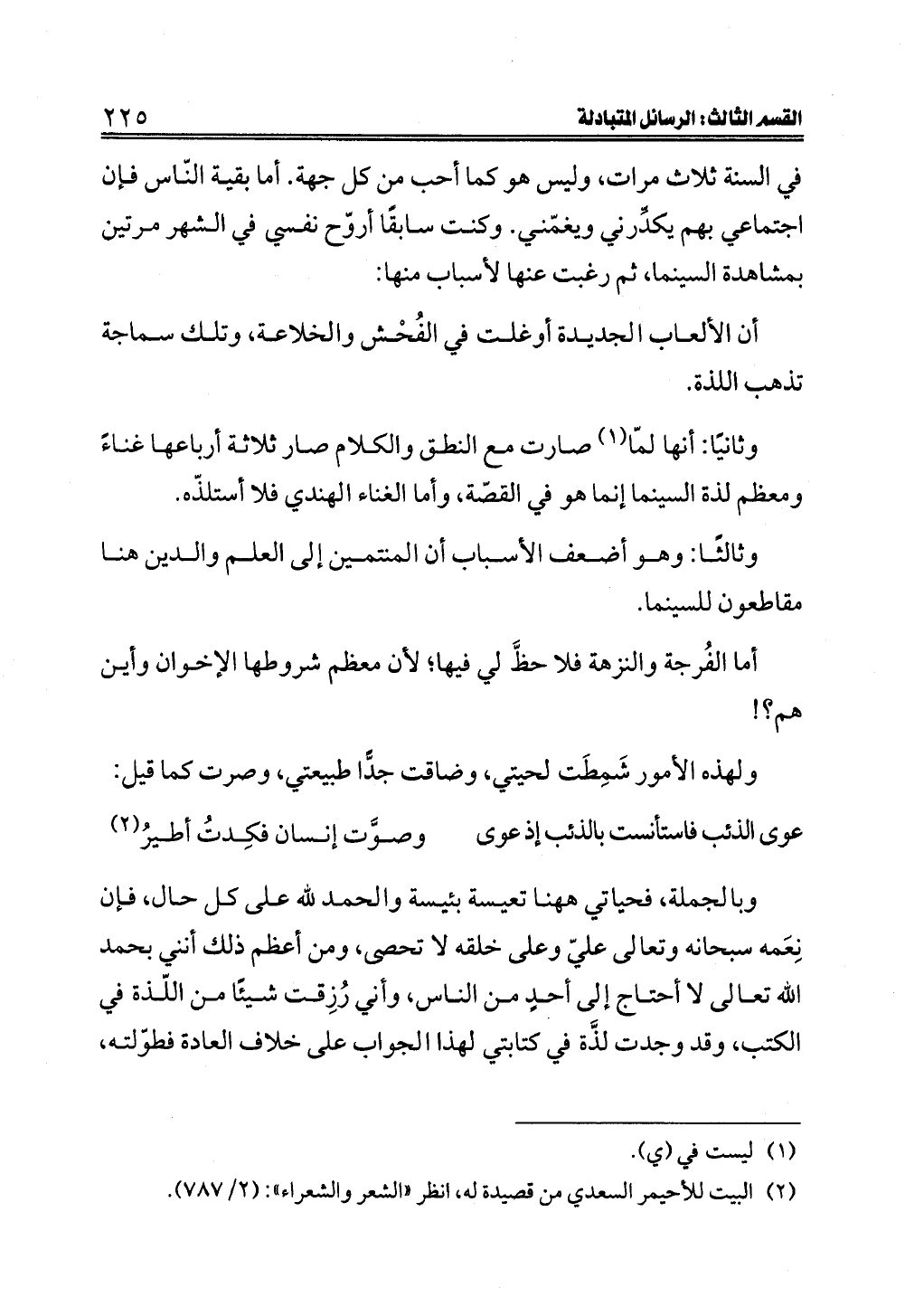 في السنة ثلاث مرات، وليس هو كما أحب من كل جهة. أما بقية النّاس فإن اجتماعي بهم يكدِّرني ويغمّني. وكنت سابقًا أروّح نفسي في الشهر مرتين بمشاهدة السينما، ثم رغبت عنها لأسباب منها: