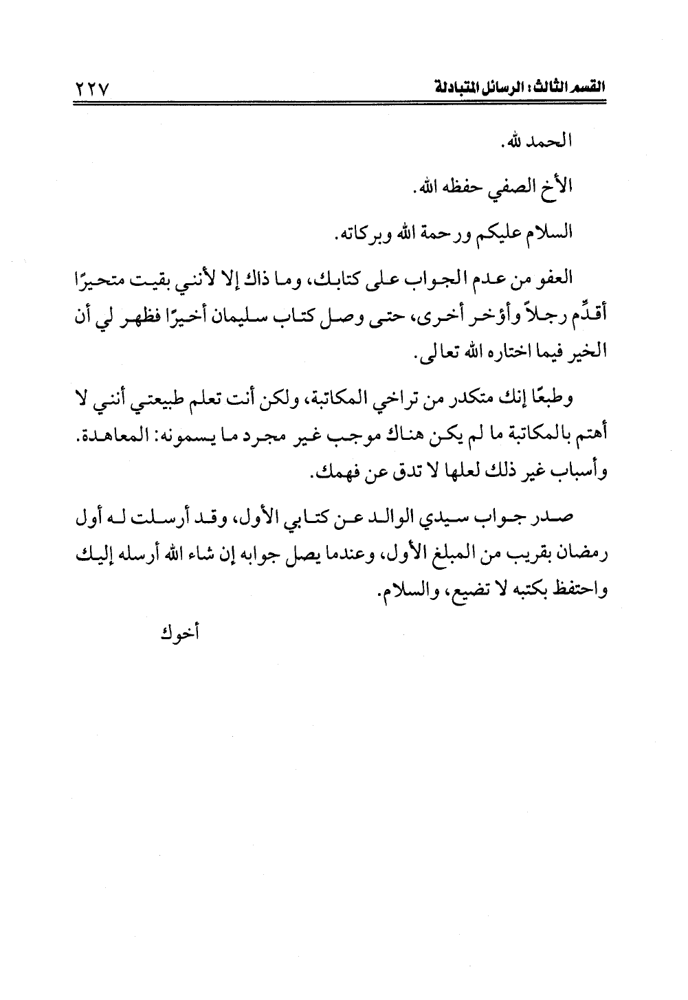 صدر جواب سيدي الوالد عن كتابي الأول، وقد أرسلت له أول رمضان بقريب من المبلغ الأول، وعندما يصل جوابه إن شاء الله أرسله إليك واحتفظ بكتبه لا تضيع، والسلام.