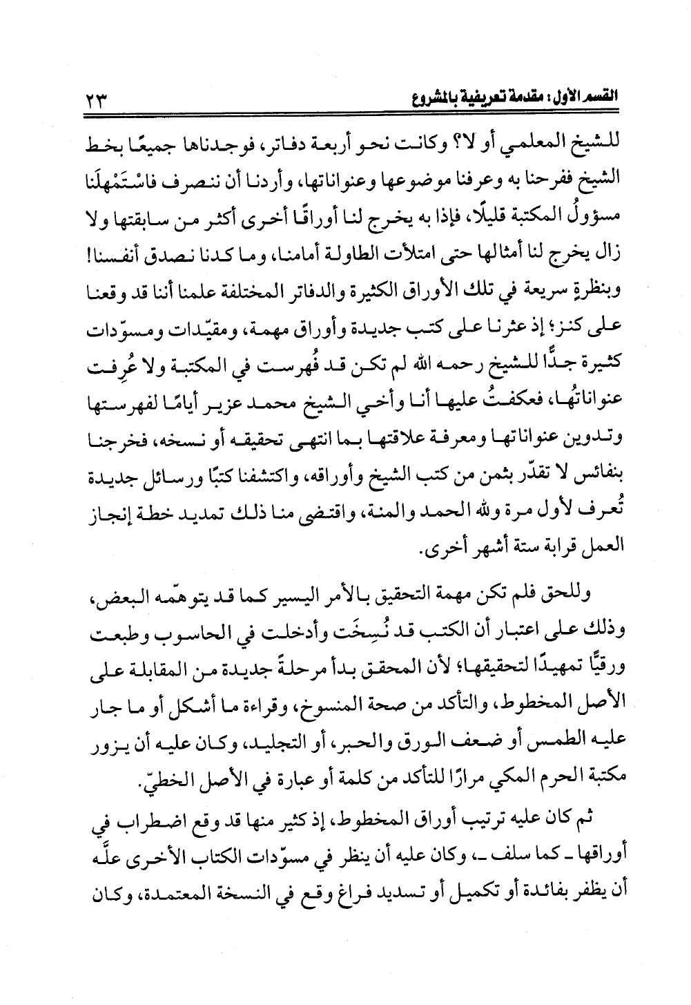 للشيخ المعلمي أو لا؟ وكانت نحو أربعة دفاتر، فوجدناها جميعًا بخط الشيخ ففرحنا به وعرفنا موضوعها وعنواناتها، وأردنا أن ننصرف فاسْتَمْهلَنا مسؤولُ المكتبة قليلًا، فإذا به يخرج لنا أوراقًا أخرى أكثر من سابقتها ولا زال يخرج لنا أمثالها حتى امتلأت الطاولة أمامنا، وما كدنا نصدق أنفسنا! وبنظرةٍ سريعة في تلك الأوراق الكثيرة والدفاتر المختلفة علمنا أننا قد وقعنا على كنز؛ إذ عثرنا على كتب جديدة وأوراق مهمة، ومقيّدات ومسوّدات كثيرة جدًّا للشيخ رحمه الله لم تكن قد فُهرست في المكتبة ولا عُرِفت عنواناتُها، فعكفتُ عليها أنا وأخي الشيخ محمد عزير أيامًا لفهرستها وتدوين عنواناتها ومعرفة علاقتها بما انتهى تحقيقه أو نسخه، فخرجنا بنفائس لا تقدّر بثمن من كتب الشيخ وأوراقه، واكتشفنا كتبًا ورسائل جديدة تُعرف لأول مرة ولله الحمد والمنة، واقتضى منا ذلك تمديد خطة إنجاز العمل قرابة ستة أشهر أخرى.