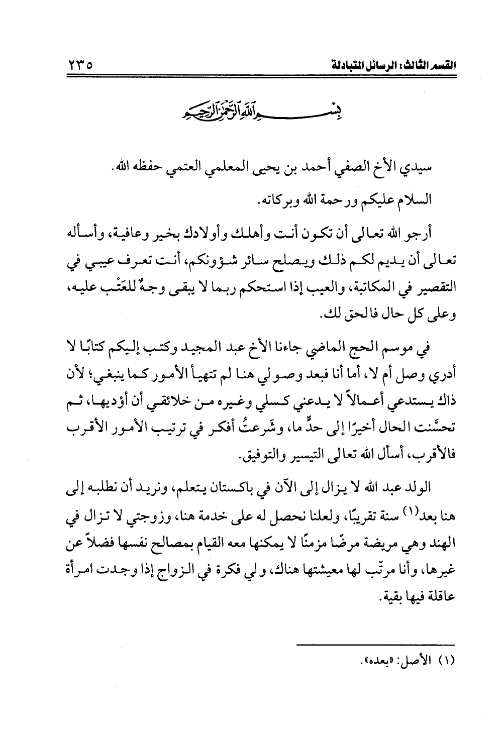 الولد عبد الله لا يزال إلى الآن في باكستان يتعلم، ونريد أن نطلبه إلى هنا بعد (¬١) سنة تقريبًا، ولعلنا نحصل له على خدمة هنا، وزوجتي لا تزال في الهند وهي مريضة مرضًا مزمنًا لا يمكنها معه القيام بمصالح نفسها فضلاً عن غيرها، وأنا مرتّب لها معيشتها هناك، ولي فكرة في الزواج إذا وجدت امرأة عاقلة فيها بقية.