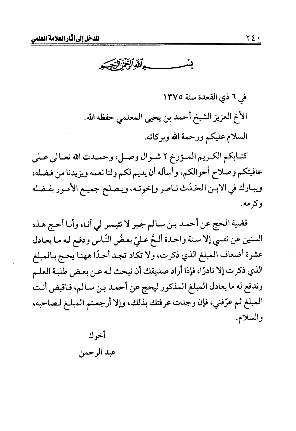 قضية الحج عن أحمد بن سالم جبر لا تتيسر لي أنا، وأنا أحج هذه السنين عن نفسي إلا سنة واحدة ألحَّ عليّ بعضُ النّاس ودفع له ما يعادل عشرة أضعاف المبلغ الذي ذكرت، ولا تكاد تجد أحدًا ههنا يحج بالمبلغ الذي ذكرت إلا نادرًا، فإذا أراد صديقك أن نبحث له عن بعض طلبة العلم وندفع له ما يعادل المبلغ المذكور ليحج عن أحمد بن سالم، فاقبض أنت المبلغ ثم عرّفني، فإن وجدت عرفتك بذلك، وإلا أرجعتم المبلغ لصاحبه، والسلام.