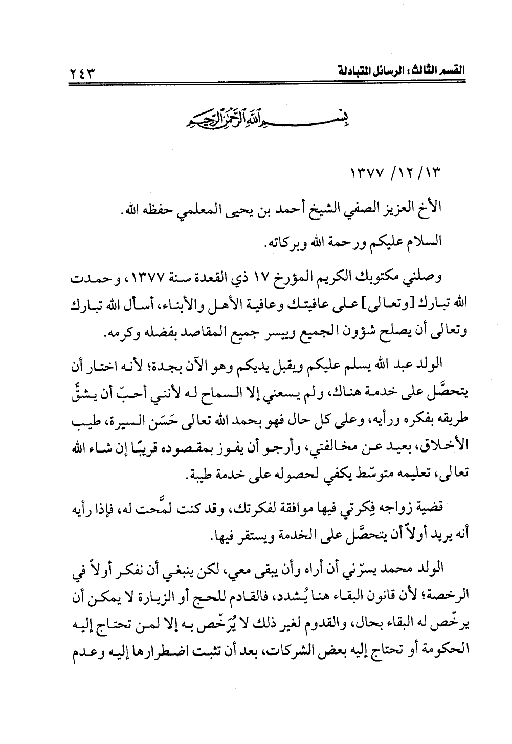 وصلني مكتوبك الكريم المؤرخ ١٧ ذي القعدة سنة ١٣٧٧، وحمدت الله تبارك [وتعالى] على عافيتك وعافية الأهل والأبناء، أسأل الله تبارك وتعالى أن يصلح شؤون الجميع وييسر جميع المقاصد بفضله وكرمه.