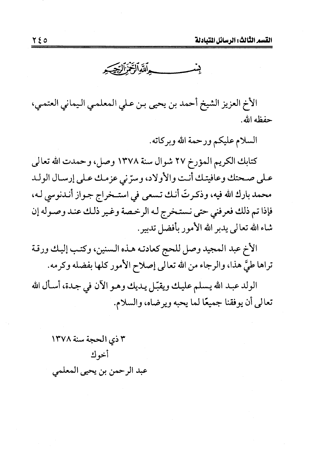كتابك الكريم المؤرخ ٢٧ شوال سنة ١٣٧٨ وصل، وحمدت الله تعالى على صحتك وعافيتك أنت والأولاد، وسرّني عزمك على إرسال الولد محمد بارك الله فيه، وذكرتَ أنك تسعى في استخراج جواز أندنوسي له، فإذا تم ذلك فعرفني حتى نستخرج له الرخصة وغير ذلك عند وصوله إن شاء الله تعالى يدبر الله الأمور بأفضل تدبير.