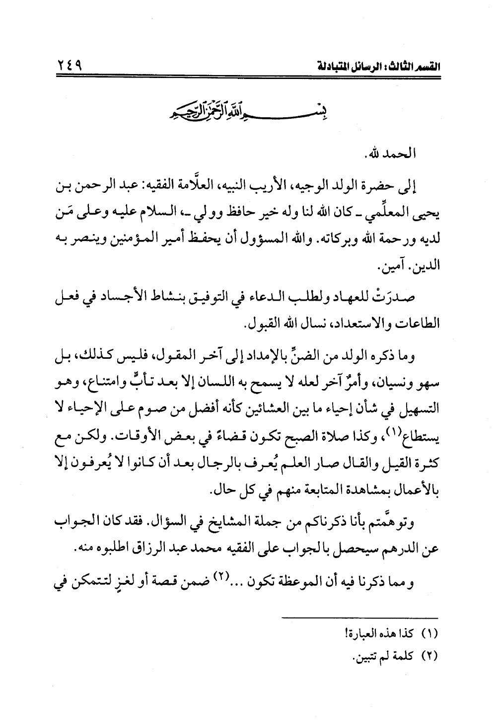 إلى حضرة الولد الوجيه، الأريب النبيه، العلَّامة الفقيه: عبد الرحمن بن يحيى المعلِّمي ــ كان الله لنا وله خير حافظ وولي ــ، السلام عليه وعلى مَن لديه ورحمة الله وبركاته. والله المسؤول أن يحفظ أمير المؤمنين وينصر به الدين. آمين.