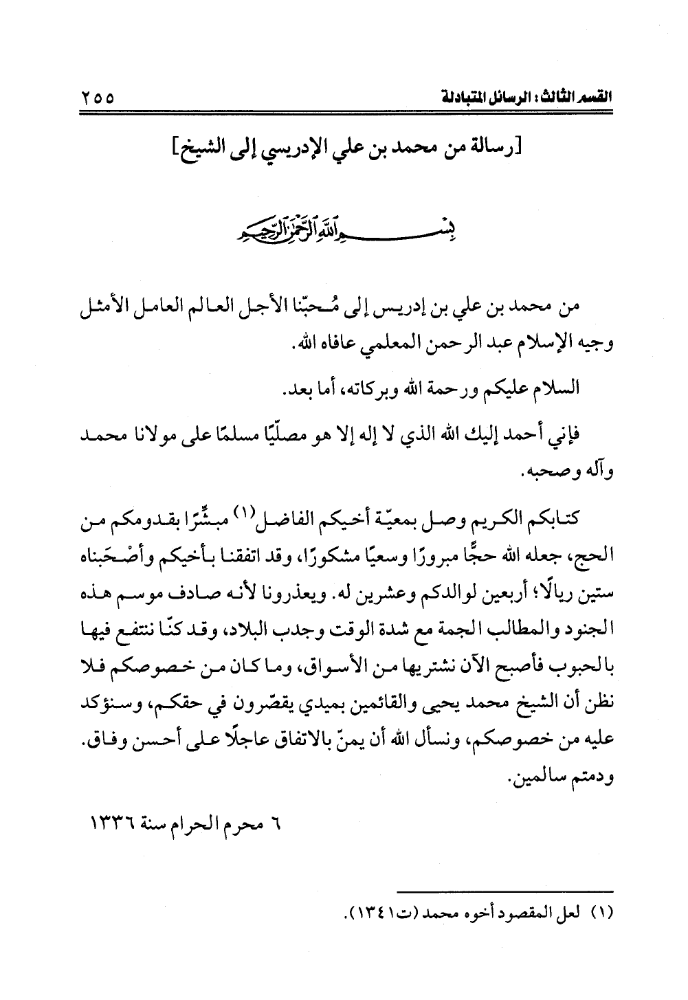 من محمد بن علي بن إدريس إلى مُحبّنا الأجل العالم العامل الأمثل وجيه الإسلام عبد الرحمن المعلمي عافاه الله.