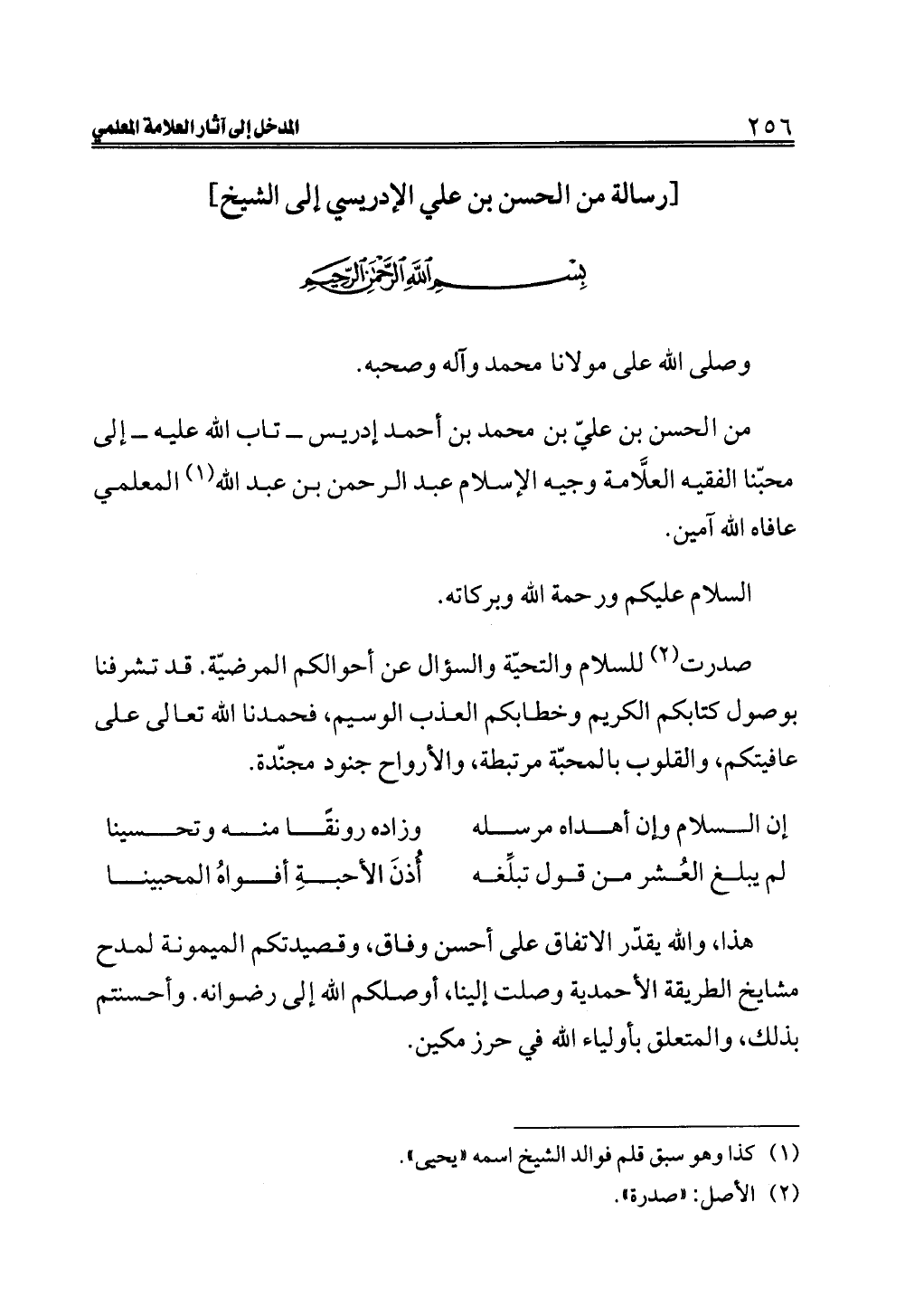 من الحسن بن عليّ بن محمد بن أحمد إدريس ــ تاب الله عليه ــ إلى محبّنا الفقيه العلَّامة وجيه الإسلام عبد الرحمن بن عبد الله (¬١) المعلمي عافاه الله آمين.