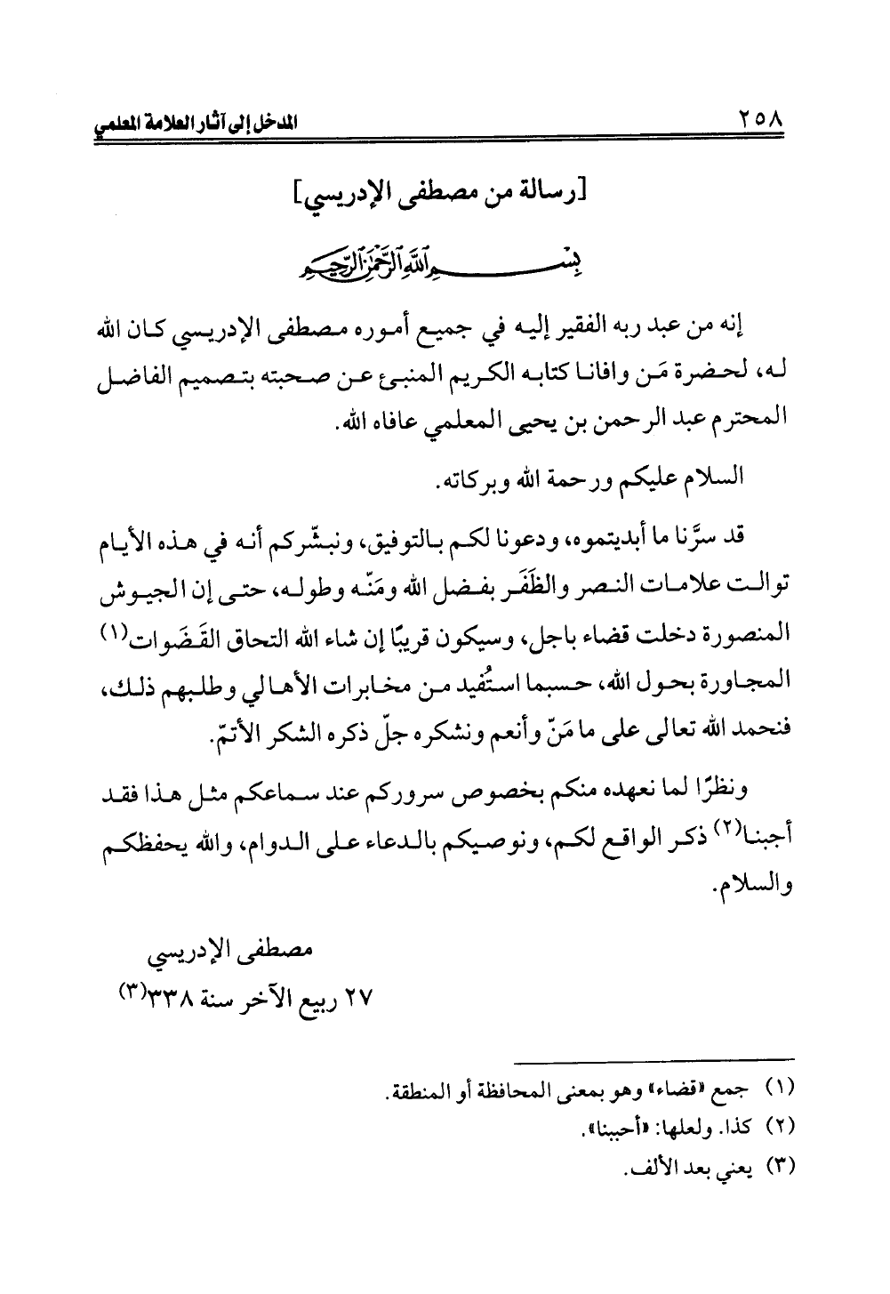 إنه من عبد ربه الفقير إليه في جميع أموره مصطفى الإدريسي كان الله له، لحضرة مَن وافانا كتابه الكريم المنبئ عن صحبته بتصميم الفاضل المحترم عبد الرحمن بن يحيى المعلمي عافاه الله.