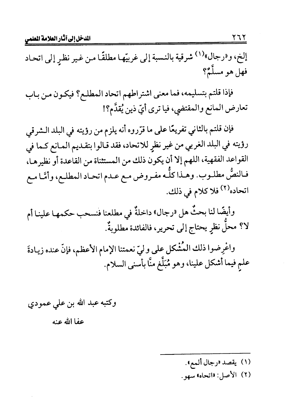 فإن قلتم بالثاني تفريعًا على ما قرّروه أنه يلزم من رؤيته في البلد الشرقي رؤيته في البلد الغربي من غير نظرٍ للاتحاد، فقد قالوا بتقديم المانع كما في القواعد الفقهية، اللهم إلا أن يكون ذلك من المستثناة من القاعدة أو نظيرها، فالنصُّ مطلوب. وهذا كلُّه مفروض مع عدم اتحاد المطلع، وأمَّا مع اتحاده (¬٢) فلا كلام في ذلك.