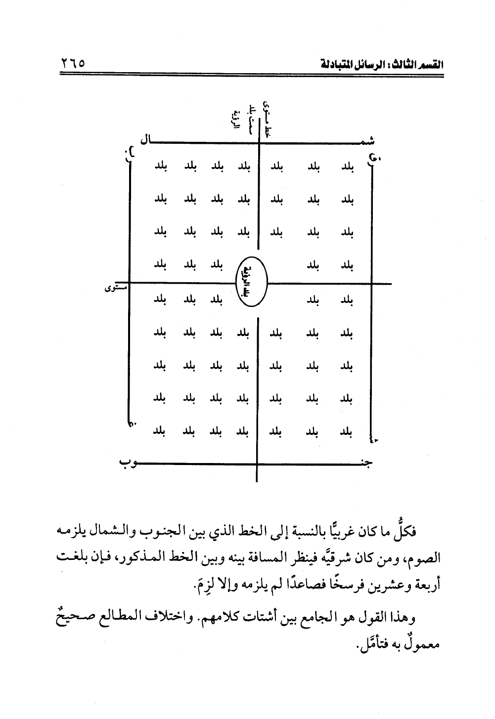 فكلُّ ما كان غربيًّا بالنسبة إلى الخط الذي بين الجنوب والشمال يلزمه الصوم، ومن كان شرقيَّه فينظر المسافة بينه وبين الخط المذكور، فإن بلغت أربعة وعشرين فرسخًا فصاعدًا لم يلزمه وإلا لزِمَ.