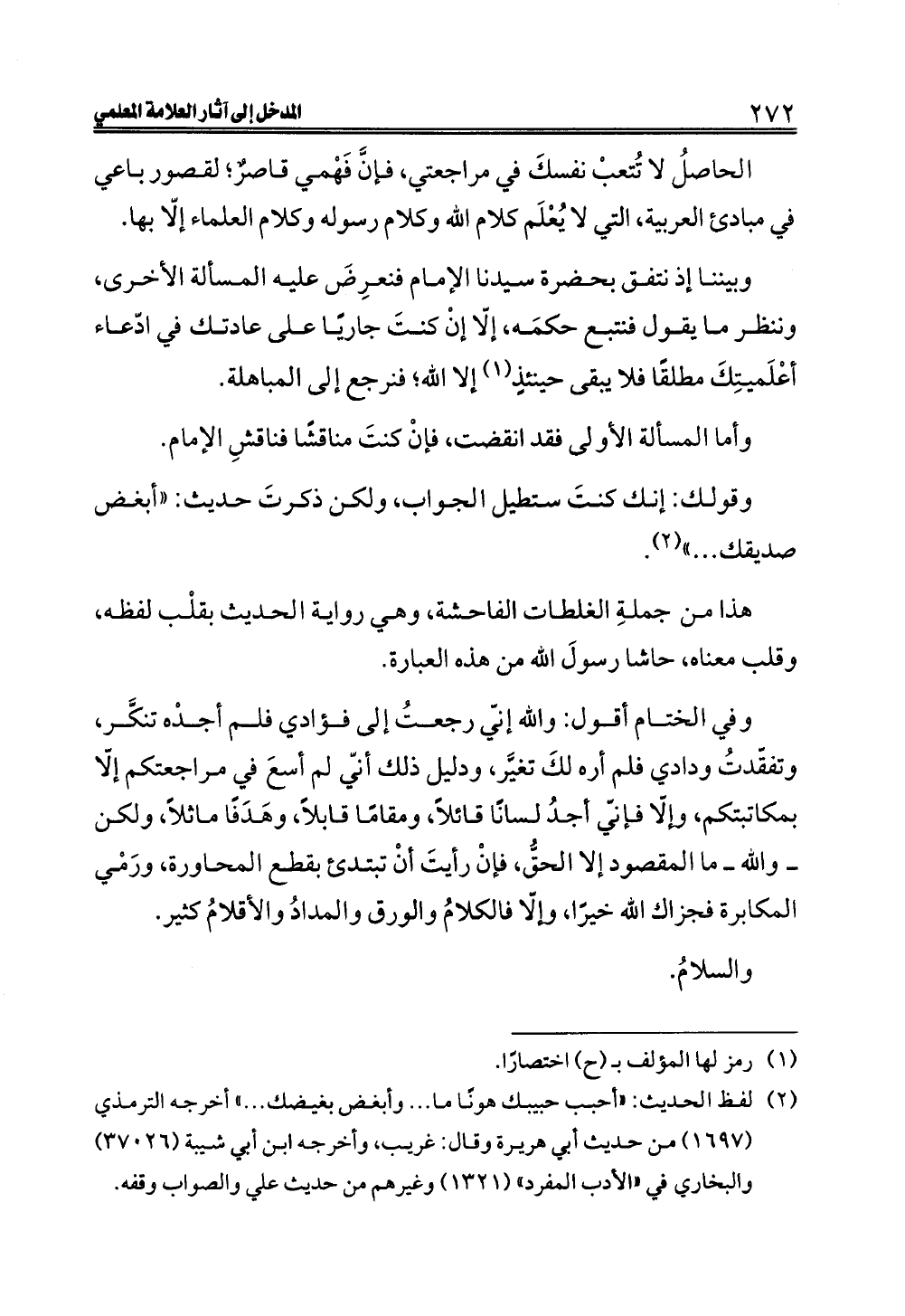 وفي الختام أقول: والله إنّي رجعتُ إلى فؤادي فلم أجدْه تنكَّر، وتفقّدتُ ودادي فلم أره لكَ تغيَّر، ودليل ذلك أنّي لم أسعَ في مراجعتكم إلّا بمكاتبتكم، وإلّا فإنّي أجدُ لسانًا قائلاً، ومقامًا قابلاً، وهَدَفًا ماثلاً، ولكن ــ والله ــ ما المقصود إلا الحقُّ، فإنْ رأيتَ أنْ تبتدئ بقطع المحاورة، ورَمْي المكابرة فجزاك الله خيرًا، وإلّا فالكلامُ والورق والمدادُ والأقلامُ كثير.