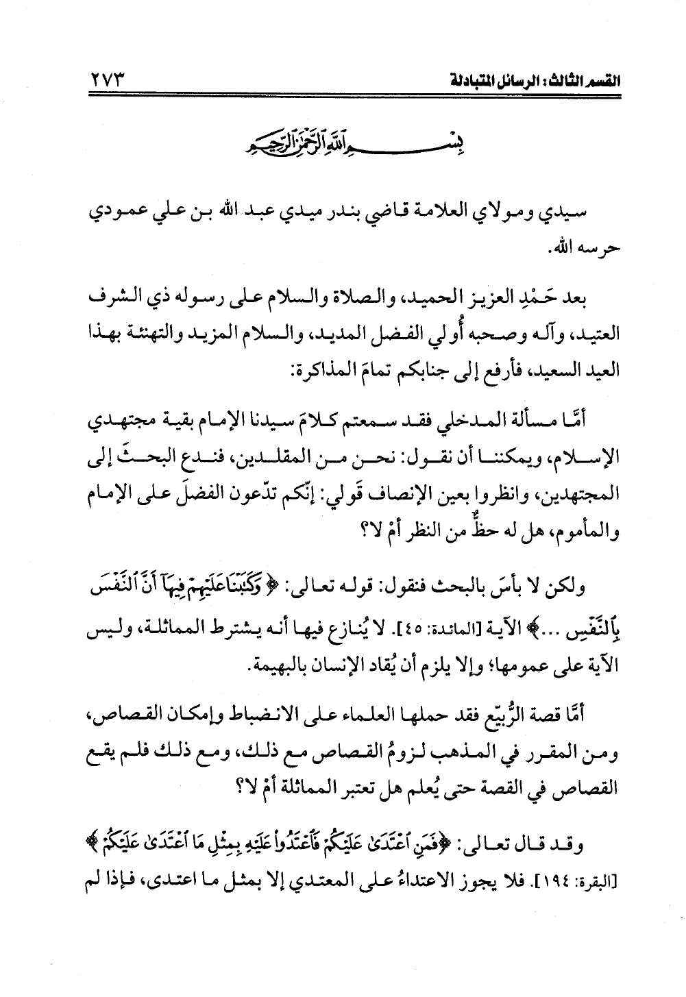 بعد حَمْدِ العزيز الحميد، والصلاة والسلام على رسوله ذي الشرف العتيد، وآله وصحبه أُولي الفضل المديد، والسلام المزيد والتهنئة بهذا العيد السعيد، فأرفع إلى جنابكم تمامَ المذاكرة: