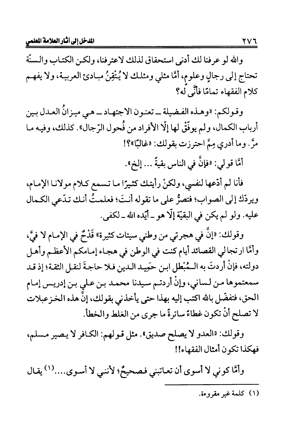 فأنا لم أدّعها لنفسي، ولكنْ رأيتك كثيرًا ما تسمع كلام مولانا الإمام، ويردّك إلى الصواب؛ فتصرُّ على ما تقوله أنتَ؛ فعلمتُ أنك تدّعي الكمال عليه. ولو لم يكن في البقيّة إلّا هو ــ أيّده الله ــ لكفى.