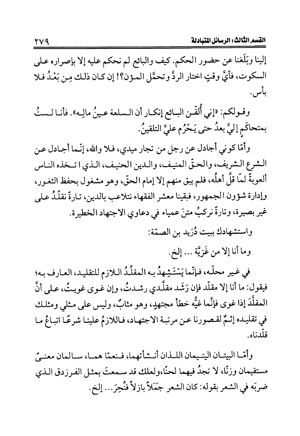 وأمّا كوني أجادل عن رجل من تجار ميدي، فلا والله، إنّما أجادل عن الشرع الشريف، والحقّ المنيف، والدين الحنيف، الذي اتخذه الناس ألعوبةً لمّا قلَّ أهلُه، فلم يبق منهم إلا إمام الحقّ، وهو مشغول بحفظ الثغور، وإدارة شؤون الجمهور، فبقينا معشر الفقهاء نتلاعب بالدين، تارةً نقلّدُ على غير بصيرة، وتارةً نركبُ متنَ عمياء في دعاوي الاجتهاد الخطيرة.