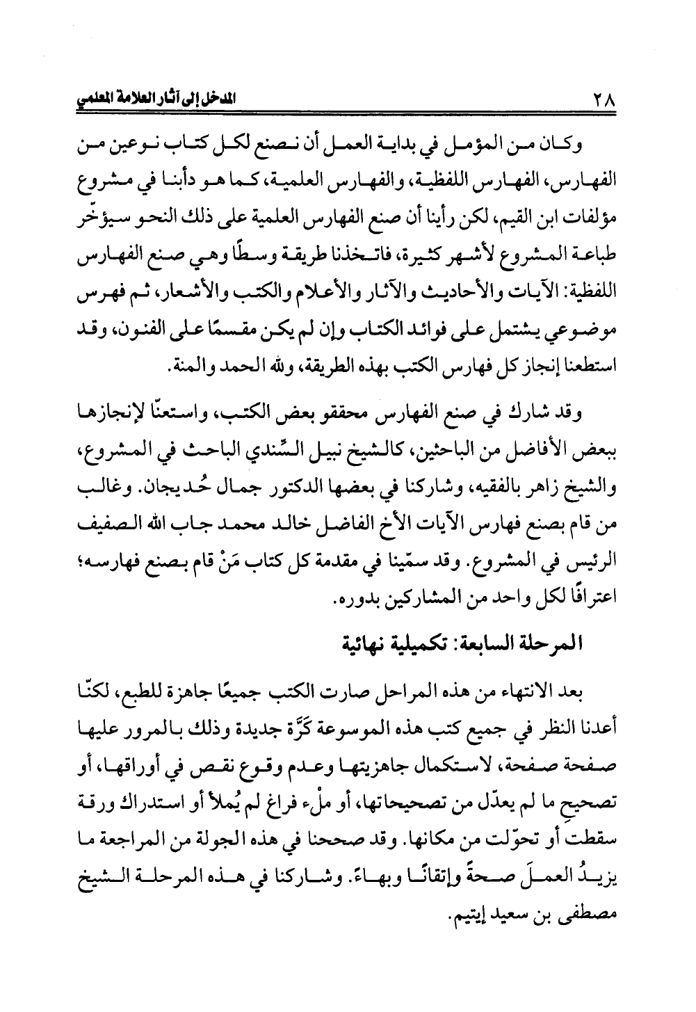 وقد شارك في صنع الفهارس محققو بعض الكتب، واستعنّا لإنجازها ببعض الأفاضل من الباحثين، كالشيخ نبيل السِّندي الباحث في المشروع، والشيخ زاهر بالفقيه، وشاركنا في بعضها الدكتور جمال حُديجان. وغالب من قام بصنع فهارس الآيات الأخ الفاضل خالد محمد جاب الله الصفيف الرئيس في المشروع. وقد سمّينا في مقدمة كل كتاب مَنْ قام بصنع فهارسه؛ اعترافًا لكل واحد من المشاركين بدوره.