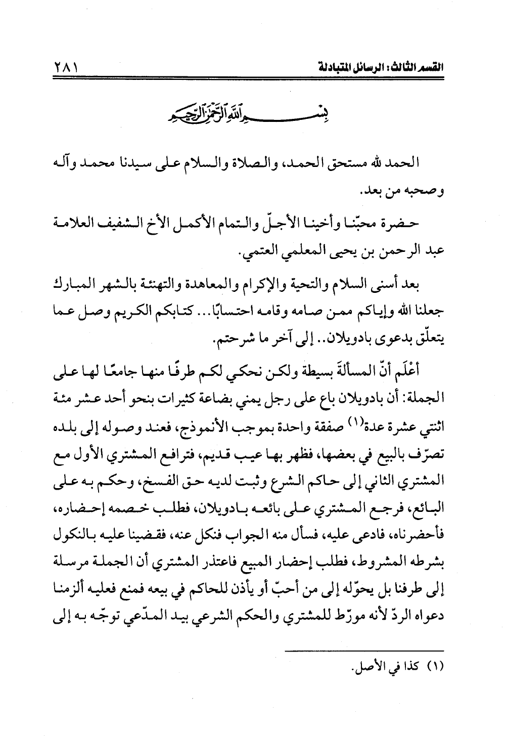 حضرة محبّنا وأخينا الأجلّ والتمام الأكمل الأخ الشفيف العلامة عبد الرحمن بن يحيى المعلمي العتمي.