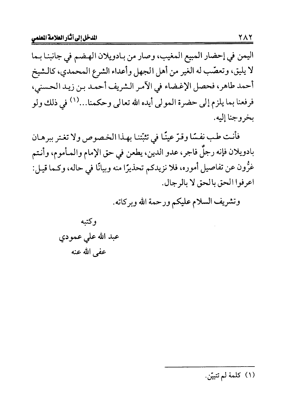 اليمن في إحضار المبيع المغيب، وصار من بادويلان الهضم في جانبنا بما لا يليق، وتعصّب له الغير من أهل الجهل وأعداء الشرع المحمدي، كالشيخ أحمد طاهر، فحصل الإغضاء في الآمر الشريف أحمد بن زيد الحسني، فرفعنا بما يلزم إلى حضرة المولى أيده الله تعالى وحكمنا ... (¬١) في ذلك ولو بخروجنا إليه.