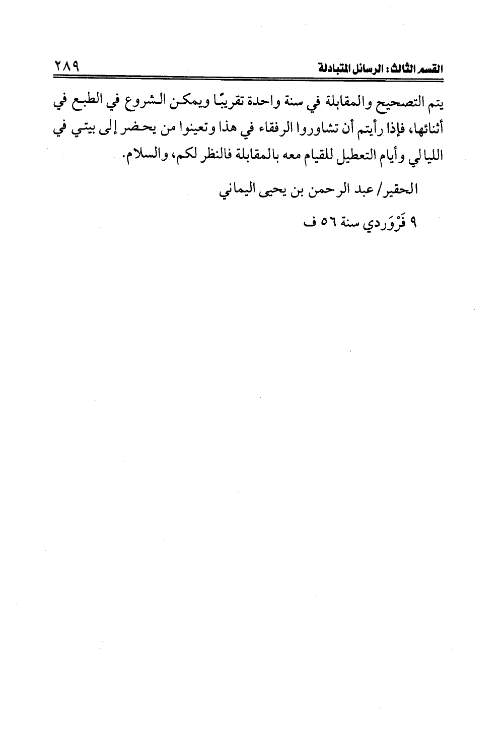 يتم التصحيح والمقابلة في سنة واحدة تقريبًا ويمكن الشروع في الطبع في أثنائها، فإذا رأيتم أن تشاوروا الرفقاء في هذا وتعينوا من يحضر إلى بيتي في الليالي وأيام التعطيل للقيام معه بالمقابلة فالنظر لكم، والسلام.