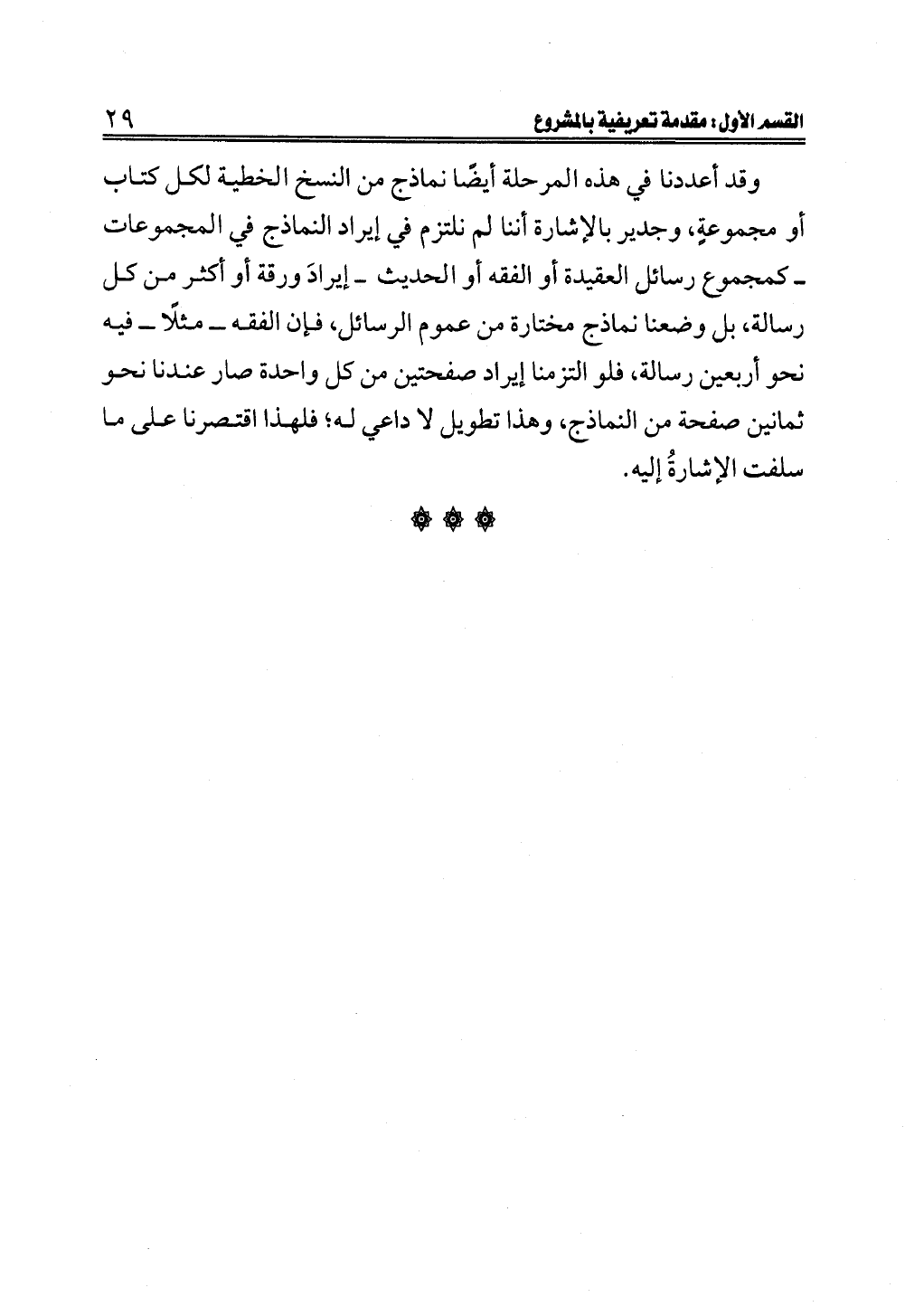 وقد أعددنا في هذه المرحلة أيضًا نماذج من النسخ الخطية لكل كتاب أو مجموعةٍ، وجدير بالإشارة أننا لم نلتزم في إيراد النماذج في المجموعات ــ كمجموع رسائل العقيدة أو الفقه أو الحديث ــ إيرادَ ورقة أو أكثر من كل رسالة، بل وضعنا نماذج مختارة من عموم الرسائل، فإن الفقه ــ مثلًا ــ فيه نحو أربعين رسالة، فلو التزمنا إيراد صفحتين من كل واحدة صار عندنا نحو ثمانين صفحة من النماذج، وهذا تطويل لا داعي له؛ فلهذا اقتصرنا على ما سلفت الإشارةُ إليه.