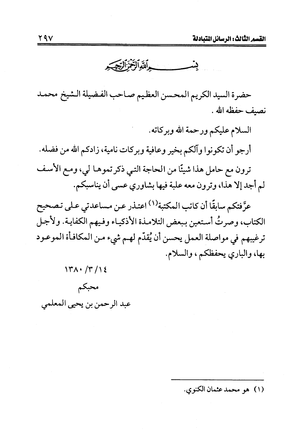 عرَّفتكم سابقًا أن كاتب المكتبة (¬١) اعتذر عن مساعدتي على تصحيح الكتاب، وصرتُ أستعين ببعض التلامذة الأذكياء وفيهم الكفاية. ولأجل ترغيبهم في مواصلة العمل يحسن أن يُقدّم لهم شيء من المكافأة الموعود بها, والباري يحفظكم، والسلام.