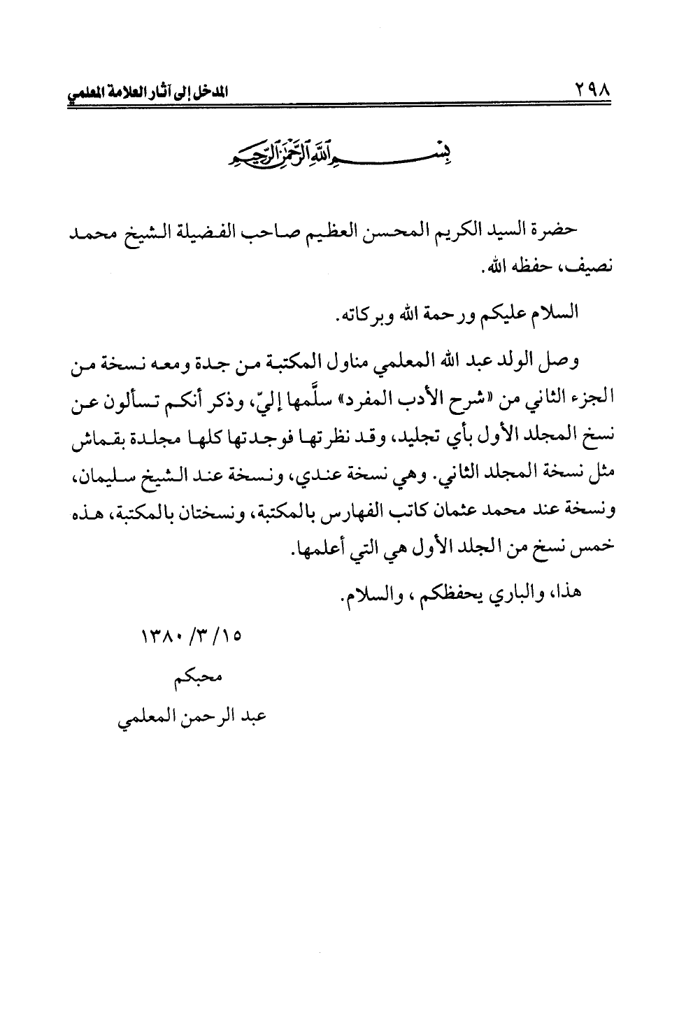 وصل الولد عبد الله المعلمي مناول المكتبة من جدة ومعه نسخة من الجزء الثاني من "شرح الأدب المفرد" سلَّمها إليّ، وذكر أنكم تسألون عن نسخ المجلد الأول بأي تجليد، وقد نظرتها فوجدتها كلها مجلدة بقماش مثل نسخة المجلد الثاني. وهي نسخة عندي، ونسخة عند الشيخ سليمان، ونسخة عند محمد عثمان كاتب الفهارس بالمكتبة، ونسختان بالمكتبة، هذه خمس نسخ من الجلد الأول هي التي أعلمها.