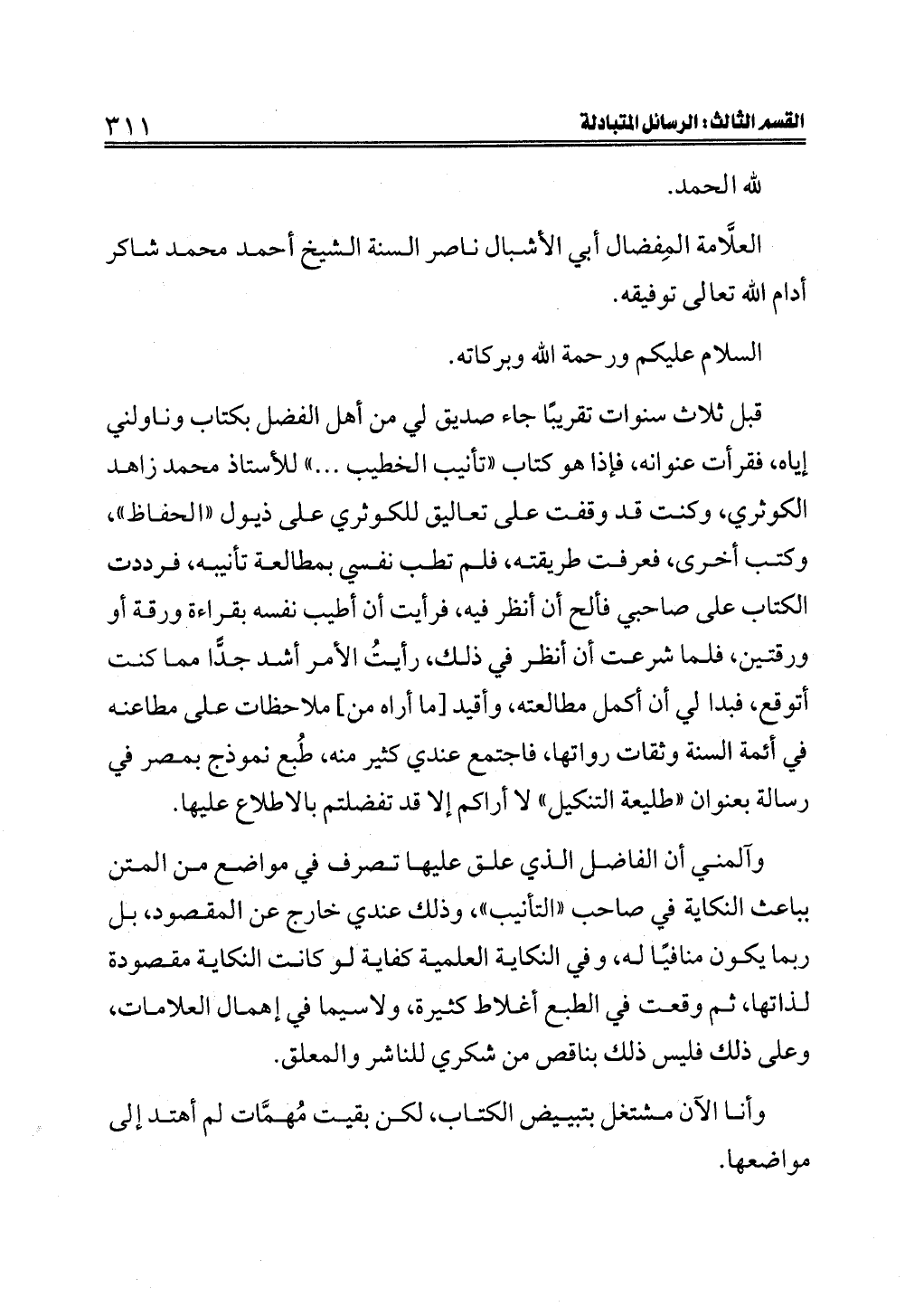 وآلمني أن الفاضل الذي علق عليها تصرف في مواضع من المتن بباعث النكاية في صاحب "التأنيب"، وذلك عندي خارج عن المقصود، بل ربما يكون منافيًا له، وفي النكاية العلمية كفاية لو كانت النكاية مقصودة لذاتها، ثم وقعت في الطبع أغلاط كثيرة، ولاسيما في إهمال العلامات، وعلى ذلك فليس ذلك بناقص من شكري للناشر والمعلق.