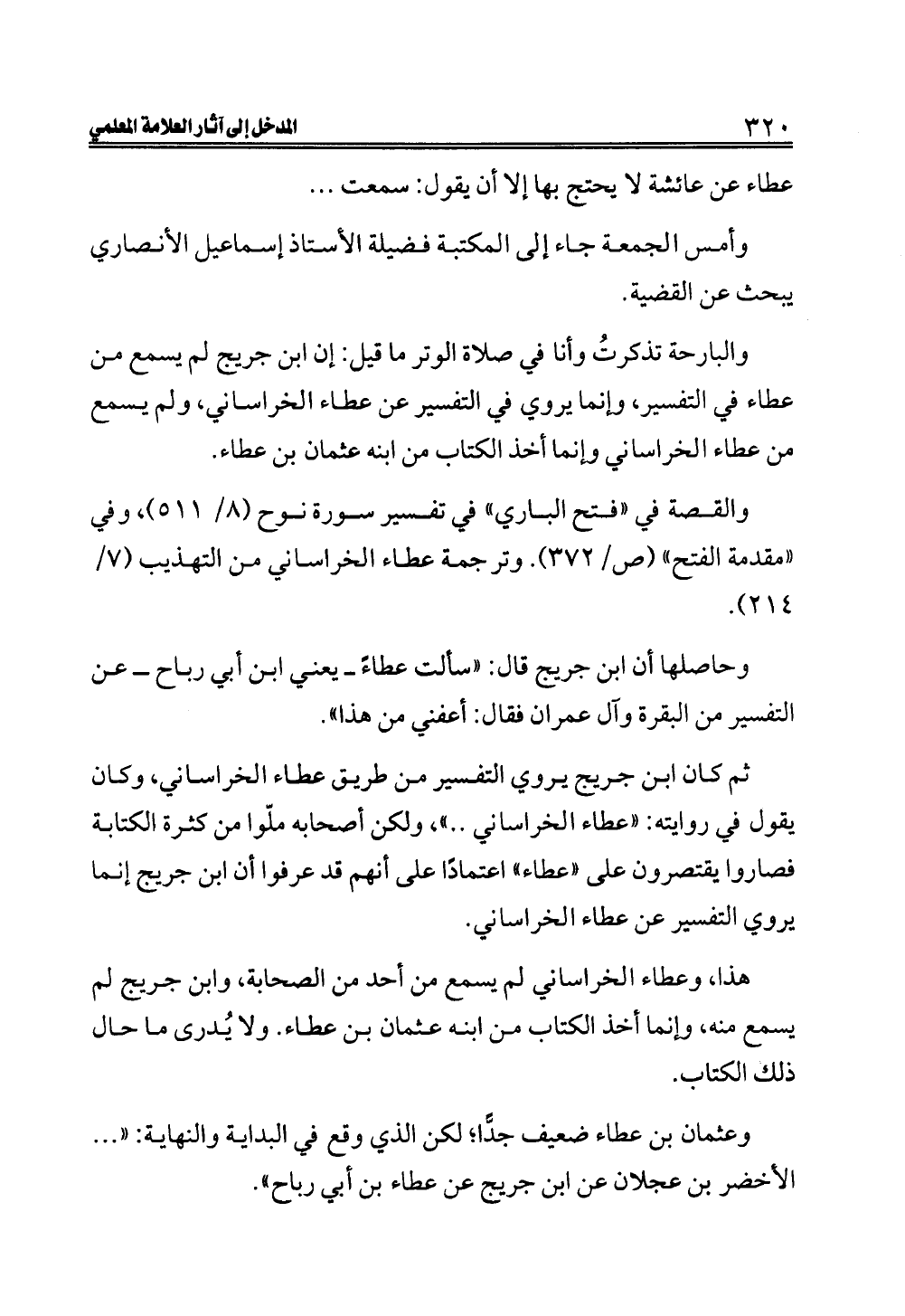والبارحة تذكرتُ وأنا في صلاة الوتر ما قيل: إن ابن جريج لم يسمع من عطاء في التفسير، وإنما يروي في التفسير عن عطاء الخراساني، ولم يسمع من عطاء الخراساني وإنما أخذ الكتاب من ابنه عثمان بن عطاء.