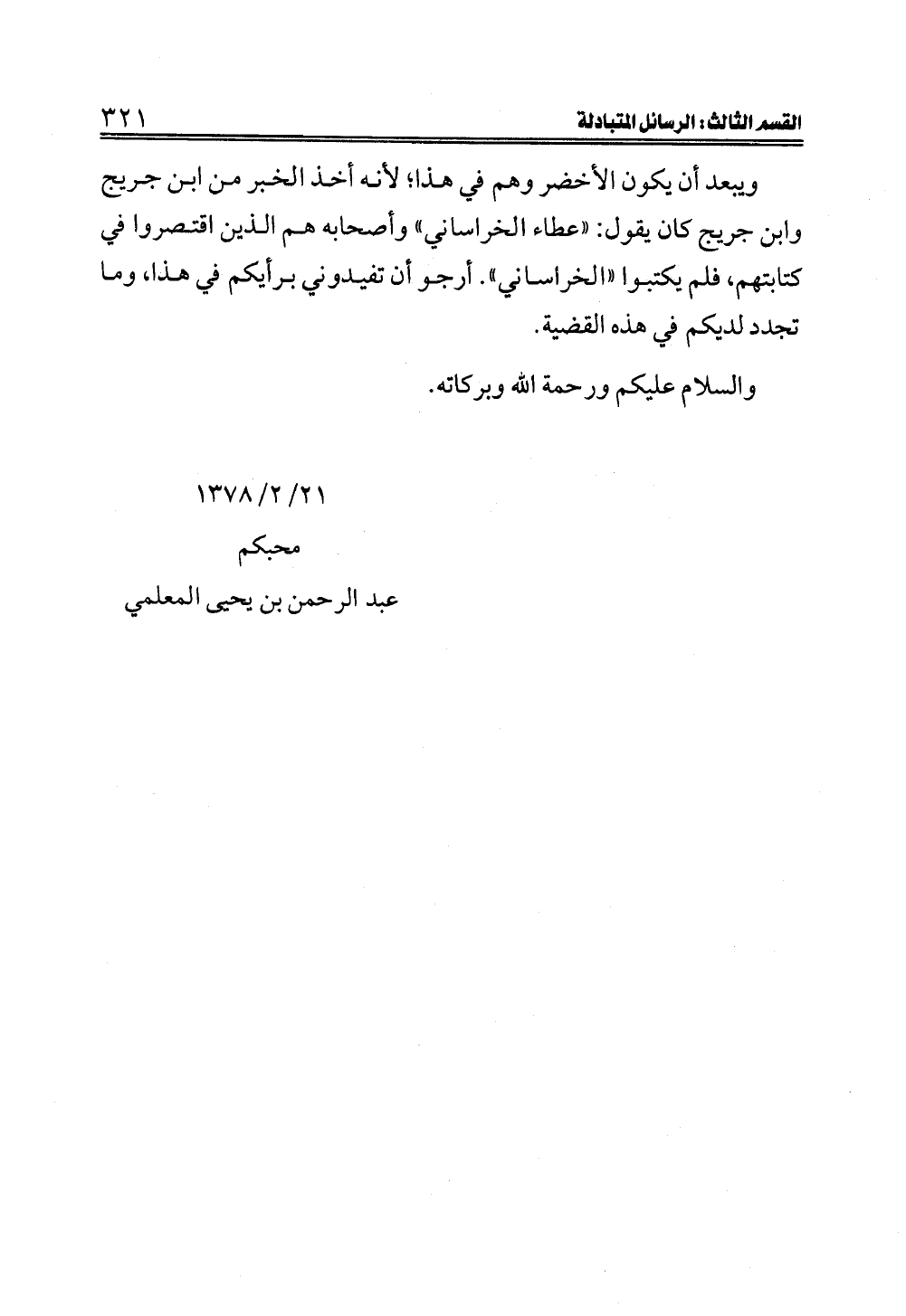 ويبعد أن يكون الأخضر وهم في هذا؛ لأنه أخذ الخبر من ابن جريج وابن جريج كان يقول: "عطاء الخراساني" وأصحابه هم الذين اقتصروا في كتابتهم، فلم يكتبوا "الخراساني". أرجو أن تفيدوني برأيكم في هذا، وما تجدد لديكم في هذه القضية.