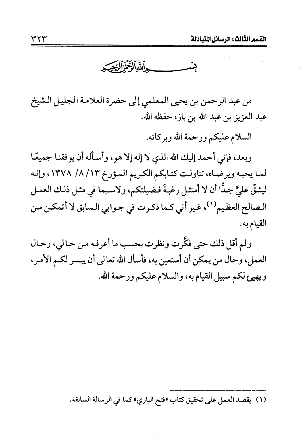 (¬١) يقصد العمل على تحقيق كتاب "فتح الباري" كما في الرسالة السابقة.