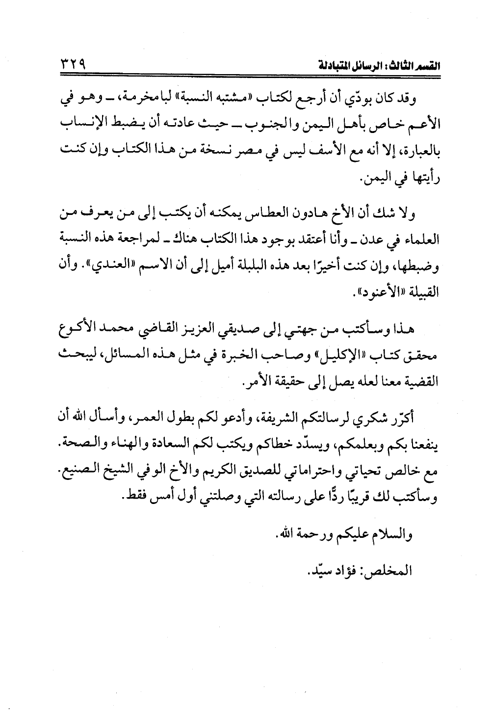 أكرّر شكري لرسالتكم الشريفة، وأدعو لكم بطول العمر، وأسأل الله أن ينفعنا بكم وبعلمكم، ويسدّد خطاكم ويكتب لكم السعادة والهناء والصحة. مع خالص تحياتي واحتراماتي للصديق الكريم والأخ الوفي الشيخ الصنيع. وسأكتب لك قريبًا ردًّا على رسالته التي وصلتني أول أمس فقط.