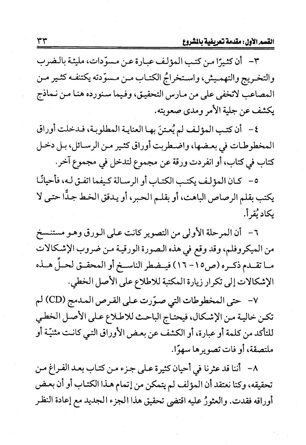 ٧ - حتى المخطوطات التي صوّرت على القرص المدمج (CD) لم تكن خالية من الإشكال، فيحتاج الباحث للاطلاع على الأصل الخطي للتأكد من كلمة أو عبارة، أو الكشف عن بعض الأوراق التي كانت مثنيّة أو ملتصقة، أو فات تصويرها سهوًا.