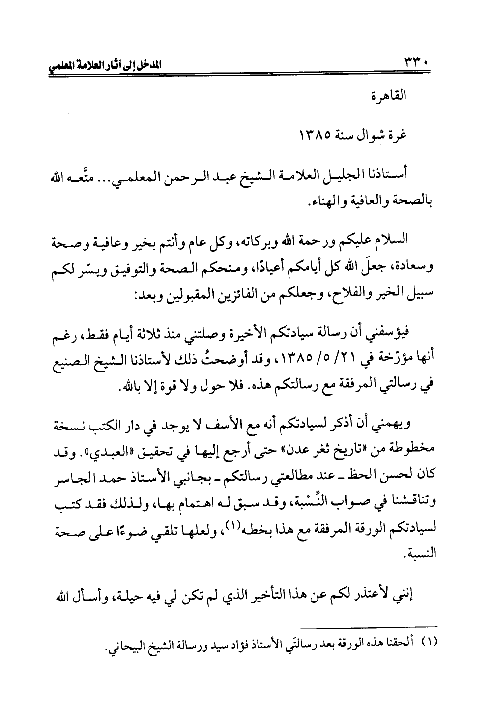 فيؤسفني أن رسالة سيادتكم الأخيرة وصلتني منذ ثلاثة أيام فقط، رغم أنها مؤرّخة في ٢١/ ٥/١٣٨٥، وقد أوضحتُ ذلك لأستاذنا الشيخ الصنيع في رسالتي المرفقة مع رسالتكم هذه. فلا حول ولا قوة إلا بالله.