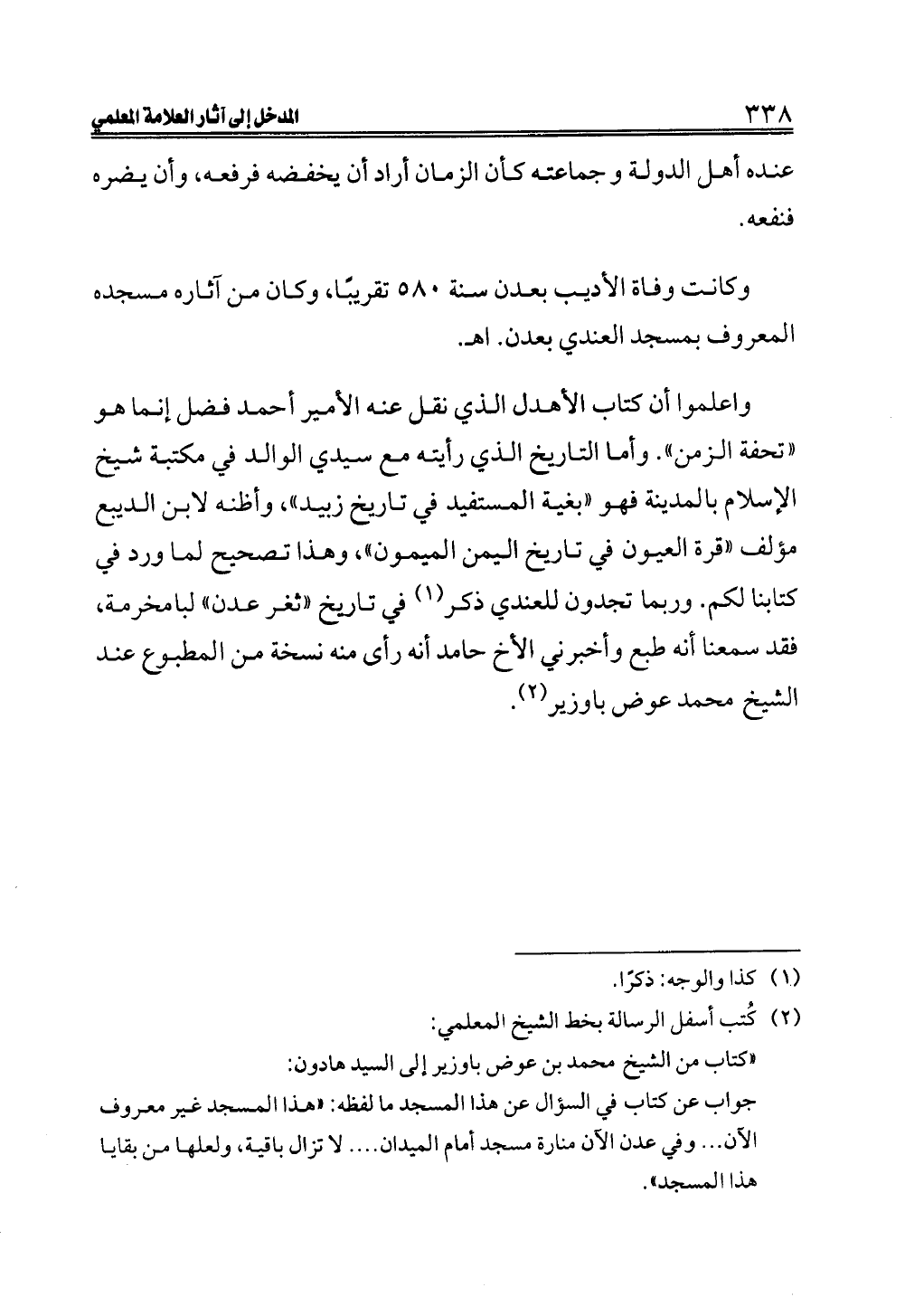 واعلموا أن كتاب الأهدل الذي نقل عنه الأمير أحمد فضل إنما هو "تحفة الزمن". وأما التاريخ الذي رأيته مع سيدي الوالد في مكتبة شيخ الإسلام بالمدينة فهو "بغية المستفيد في تاريخ زبيد"، وأظنه لابن الديبع مؤلف "قرة العيون في تاريخ اليمن الميمون"، وهذا تصحيح لما ورد في كتابنا لكم. وربما تجدون للعندي ذكر (¬١) في تاريخ "ثغر عدن" لبامخرمة، فقد سمعنا أنه طبع وأخبرني الأخ حامد أنه رأى منه نسخة من المطبوع عند الشيخ محمد عوض باوزير (¬٢).