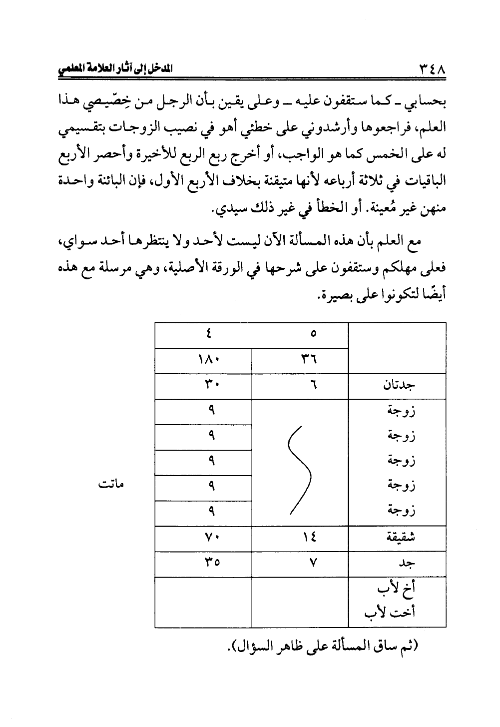 بحسابي ــ كما ستقفون عليه ــ وعلى يقين بأن الرجل من خِصّيصي هذا العلم، فراجعوها وأرشدوني على خطئي أهو في نصيب الزوجات بتقسيمي له على الخمس كما هو الواجب، أو أخرج ربع الربع للأخيرة وأحصر الأربع الباقيات في ثلاثة أرباعه لأنها متيقنة بخلاف الأربع الأول، فإن البائنة واحدة منهن غير مُعينة. أو الخطأ في غير ذلك سيدي.