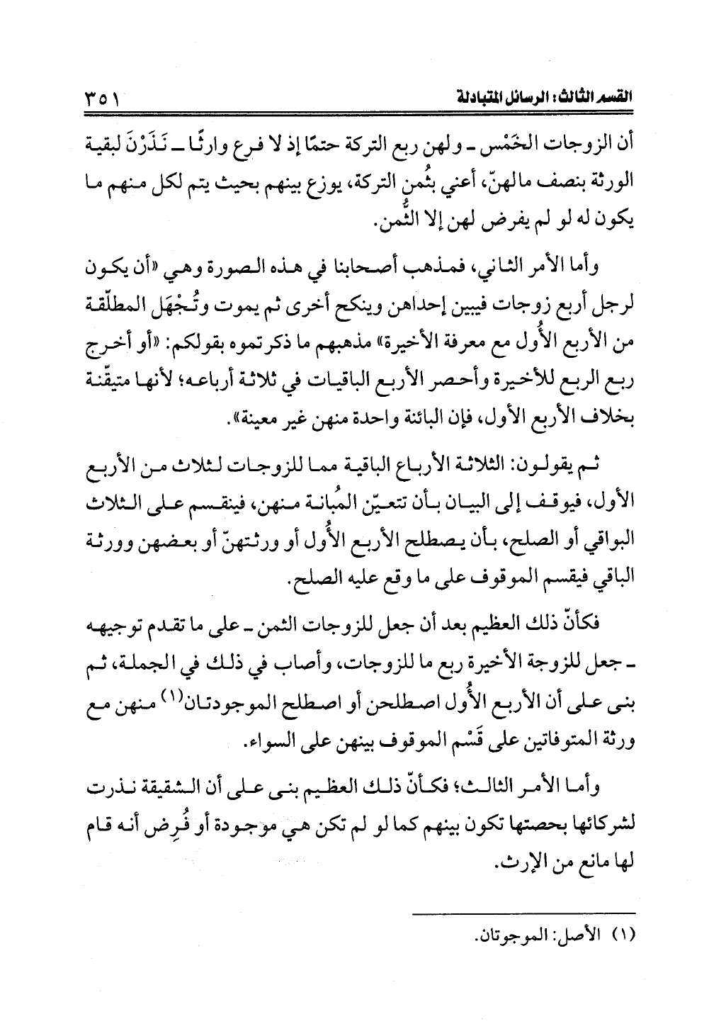 فكأنّ ذلك العظيم بعد أن جعل للزوجات الثمن ــ على ما تقدم توجيهه ــ جعل للزوجة الأخيرة ربع ما للزوجات، وأصاب في ذلك في الجملة، ثم بنى على أن الأربع الأُول اصطلحن أو اصطلح الموجودتان (¬١) منهن مع ورثة المتوفاتين على قَسْم الموقوف بينهن على السواء.
