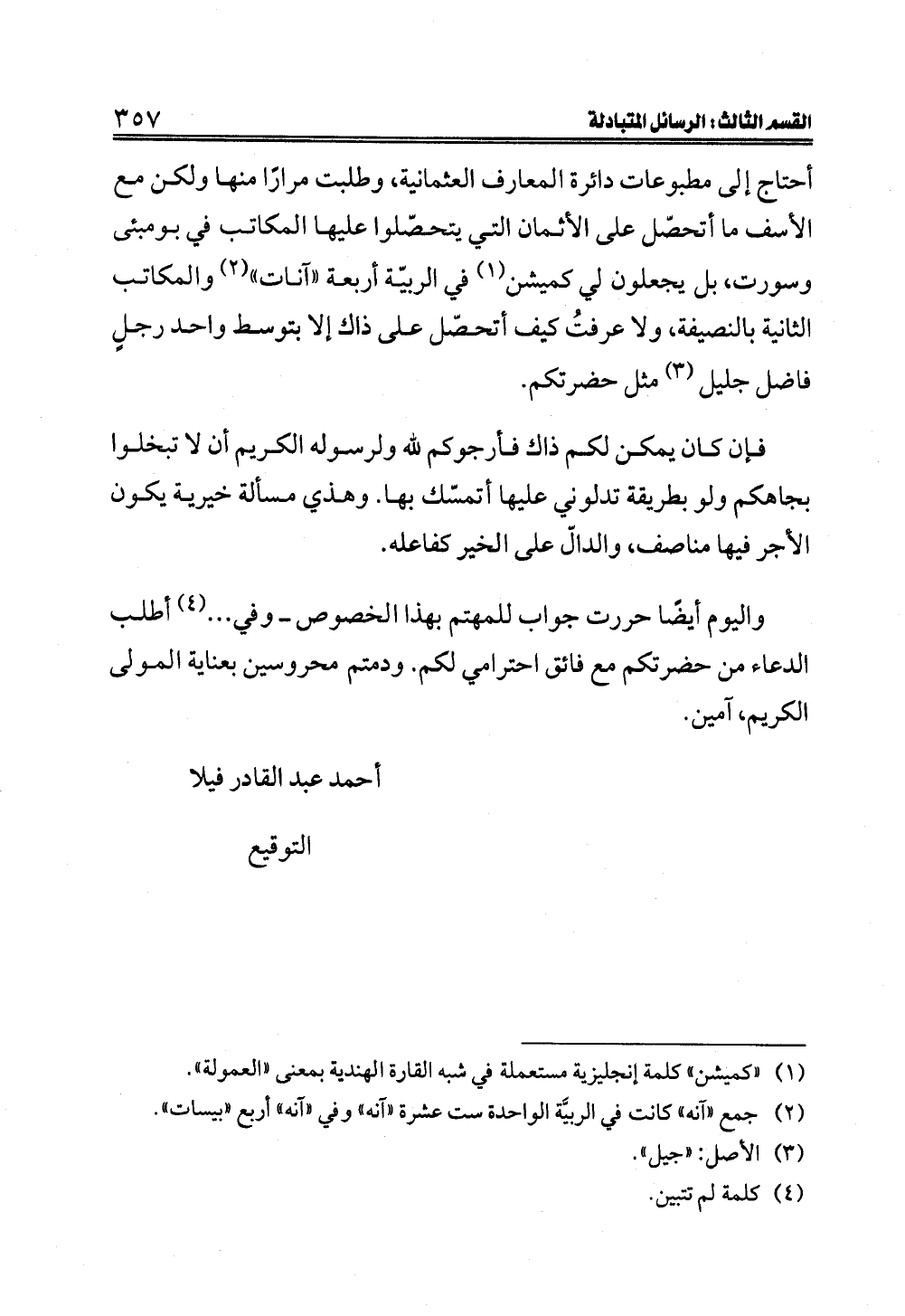 أحتاج إلى مطبوعات دائرة المعارف العثمانية، وطلبت مرارًا منها ولكن مع الأسف ما أتحصّل على الأثمان التي يتحصّلوا عليها المكاتب في بومبئى وسورت، بل يجعلون لي كميشن (¬١) في الربيّة أربعة "آنات" (¬٢) والمكاتب الثانية بالنصيفة، ولا عرفتُ كيف أتحصّل على ذاك إلا بتوسط واحد رجلٍ فاضل جليل (¬٣) مثل حضرتكم.