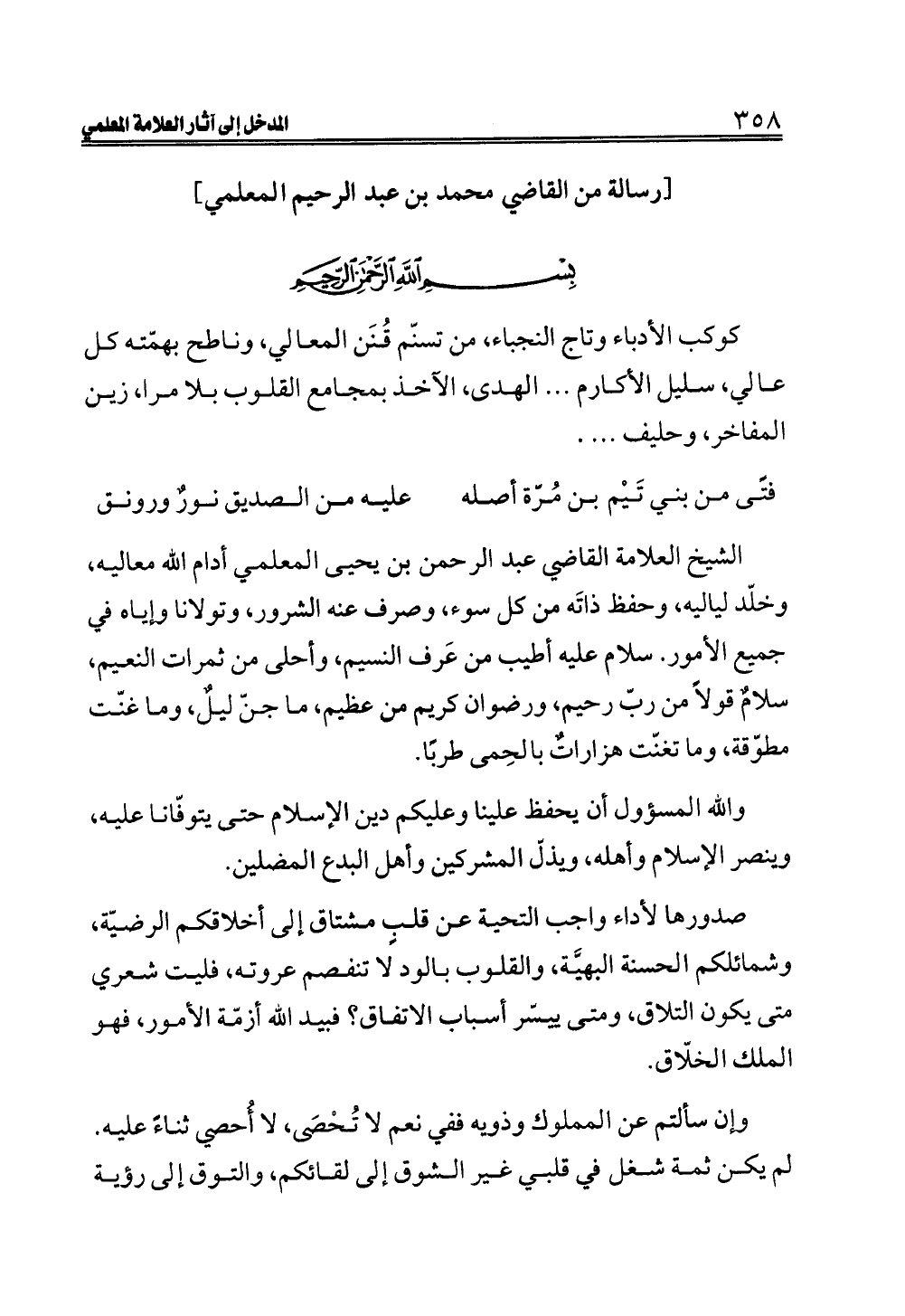 الشيخ العلامة القاضي عبد الرحمن بن يحيى المعلمي أدام الله معاليه، وخلّد لياليه، وحفظ ذاتَه من كل سوء، وصرف عنه الشرور، وتولانا وإياه في جميع الأمور. سلام عليه أطيب من عَرف النسيم، وأحلى من ثمرات النعيم، سلامٌ قولاً من ربّ رحيم، ورضوان كريم من عظيم، ما جنّ ليلٌ، وما غنّت مطوّقة، وما تغنّت هزاراتٌ بالحِمى طربًا.