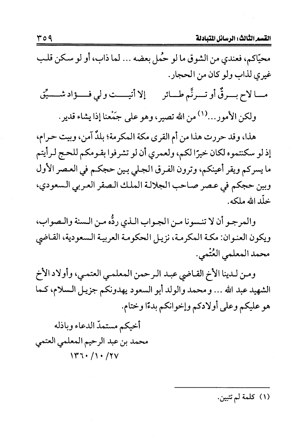والمرجو أن لا تنسونا من الجواب الذي ردُّه من السنة والصواب، ويكون العنوان: مكة المكرمة، نزيل الحكومة العربية السعودية، القاضي محمد المعلمي العُتْمي.