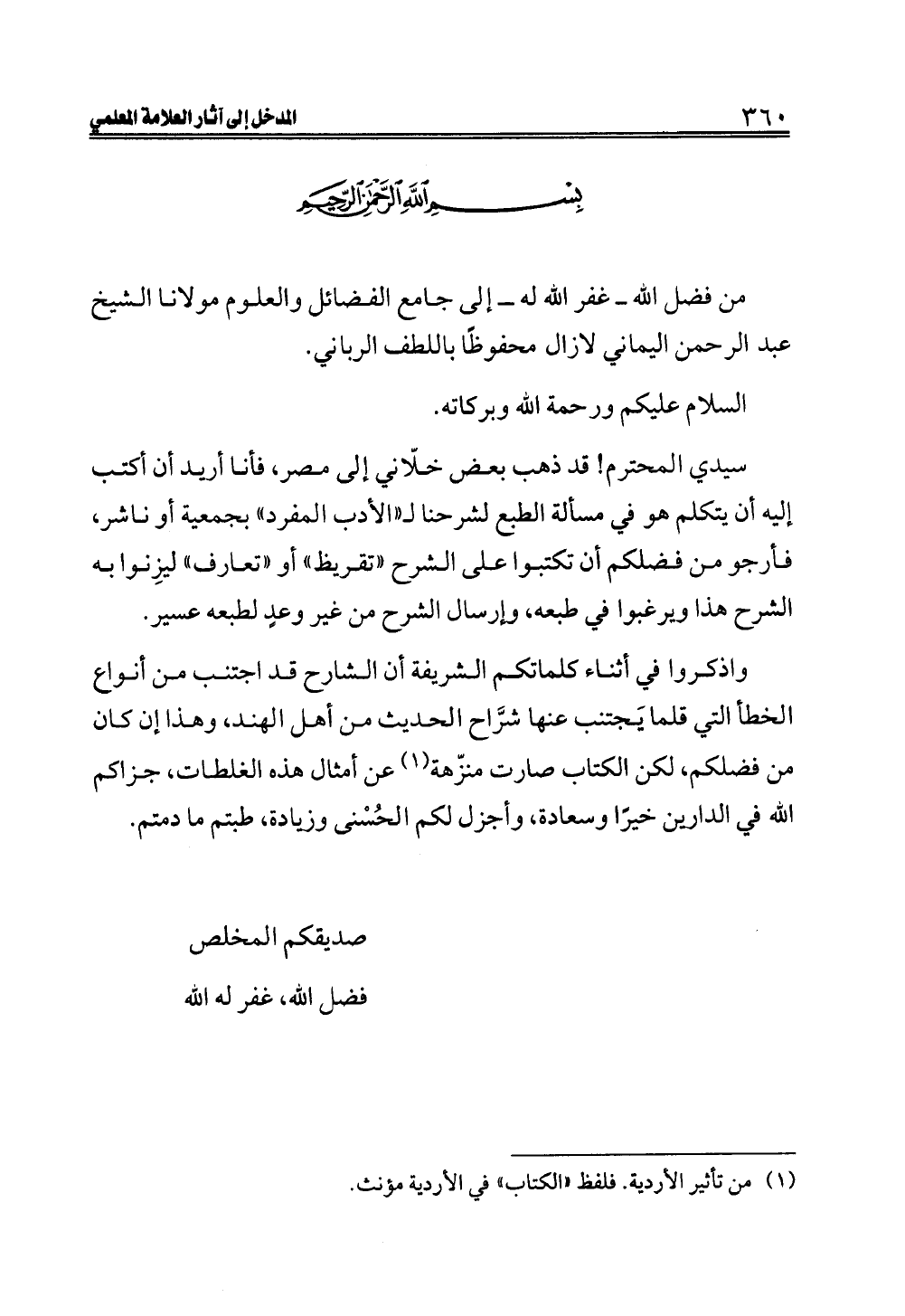 سيدي المحترم! قد ذهب بعض خلّاني إلى مصر، فأنا أريد أن أكتب إليه أن يتكلم هو في مسألة الطبع لشرحنا لـ"الأدب المفرد" بجمعية أو ناشر، فأرجو من فضلكم أن تكتبوا على الشرح "تقريظ" أو "تعارف" ليزِنوا به الشرح هذا ويرغبوا في طبعه، وإرسال الشرح من غير وعدٍ لطبعه عسير.