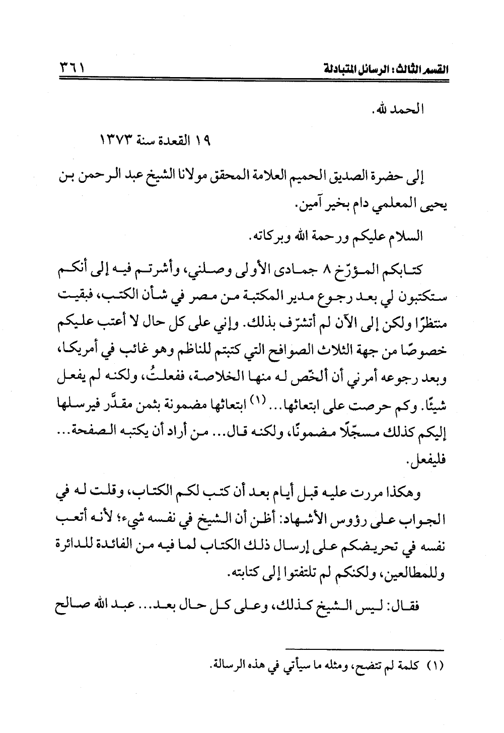 وهكذا مررت عليه قبل أيام بعد أن كتب لكم الكتاب، وقلت له في الجواب على رؤوس الأشهاد: أظن أن الشيخ في نفسه شيء؛ لأنه أتعب نفسه في تحريضكم على إرسال ذلك الكتاب لما فيه من الفائدة للدائرة وللمطالعين، ولكنكم لم تلتفتوا إلى كتابته.