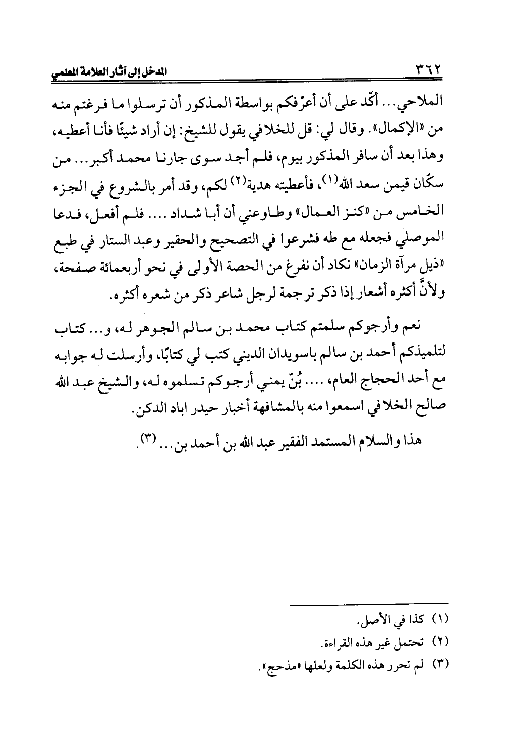 نعم وأرجوكم سلمتم كتاب محمد بن سالم الجوهر له، و ... كتاب لتلميذكم أحمد بن سالم باسويدان الديني كتب لي كتابًا، وأرسلت له جوابه مع أحد الحجاج العام، .... بُنّ يمني أرجوكم تسلموه له، والشيخ عبد الله صالح الخلافي اسمعوا منه بالمشافهة أخبار حيدر اباد الدكن.