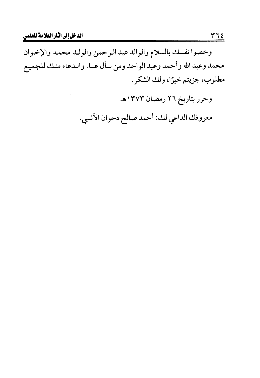 وخصوا نفسك بالسلام والوالد عبد الرحمن والولد محمد والإخوان محمد وعبد الله وأحمد وعبد الواحد ومن سأل عنا. والدعاء منك للجميع مطلوب، جزيتم خيرًا، ولك الشكر.