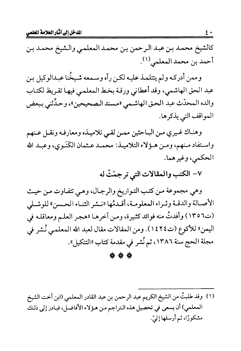 (¬١) وقد طلبتُ من الشيخ الكريم عبد الرحمن بن عبد القادر المعلمي (ابن أخت الشيخ المعلمي) أن يسعى في تحصيل هذه التراجم من هؤلاء الأفاضل، فبادر إلى ذلك مشكورًا، ثم أرسلها إليّ.