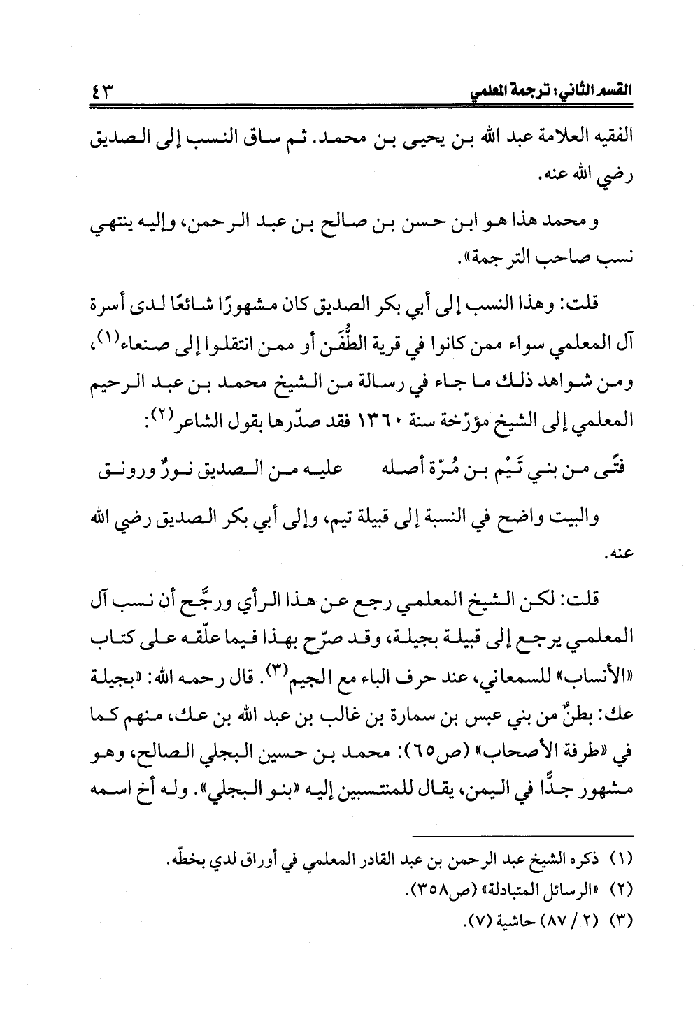 قلت: وهذا النسب إلى أبي بكر الصديق كان مشهورًا شائعًا لدى أسرة آل المعلمي سواء ممن كانوا في قرية الطُّفَن أو ممن انتقلوا إلى صنعاء (¬١)، ومن شواهد ذلك ما جاء في رسالة من الشيخ محمد بن عبد الرحيم المعلمي إلى الشيخ مؤرّخة سنة ١٣٦٠ فقد صدّرها بقول الشاعر (¬٢):