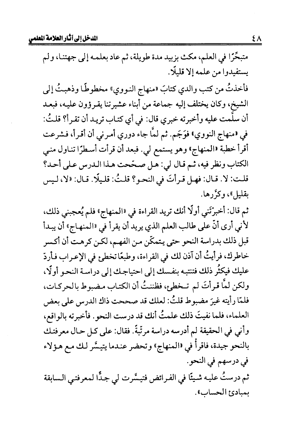فأخذتُ من كتب والدي كتابَ "منهاج النووي" مخطوطًا وذهبتُ إلى الشيخ، وكان يختلف إليه جماعة من أبناء عشيرتنا يقرؤون عليه، فبعد أن سلَّمت عليه وأخبرته خبري قال: في أي كتاب تريد أن تقرأ؟ قلتُ: في "منهاج النووي" فوَجَم. ثم لمَّا جاء دوري أمرني أن أقرأ، فشرعت أقرأ خطبة "المنهاج" وهو يستمع لي. فبعد أن قرأت أسطرًا تناول مني الكتاب ونظر فيه، ثم قال لي: هل صحّحت هذا الدرس على أحد؟ قلت: لا. قال: فهل قرأتَ في النحو؟ قلتُ: قليلًا. قال: "لا، ليس بقليل"، وكرَّرها.